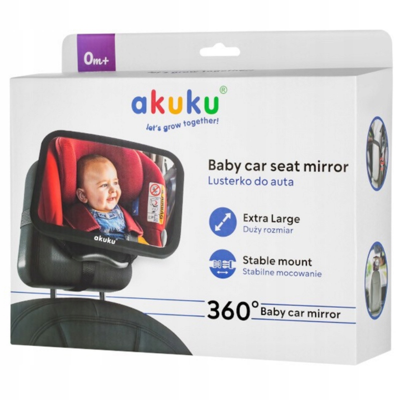 Зеркало бренда «Akuku» специально разработано, чтобы предоставить родителям возможность спокойно наблюдать за своим малышом во время путешествия в автомобиле. Благодаря этому зеркалу родитель может безопасно наблюдать за ребенком, который размещается в обращенном против хода движения автокресле, без необходимости поворачивать голову и при этом сохранять полный контроль над дорогой. .