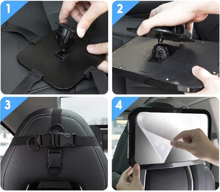 НАША МОДЕЛЬ имеет 4 ремня, застегивающихся по вертикали и горизонтали, которые крепко держат подголовник и не ослабевают; Зеркало не может соскользнуть и упасть на ребенка! Крепежная головка позволяет поворачивать зеркало на 360 градусов что позволяет точно регулировать угол, чтобы вы могли как можно больше видеть ребенка в зеркале заднего вида