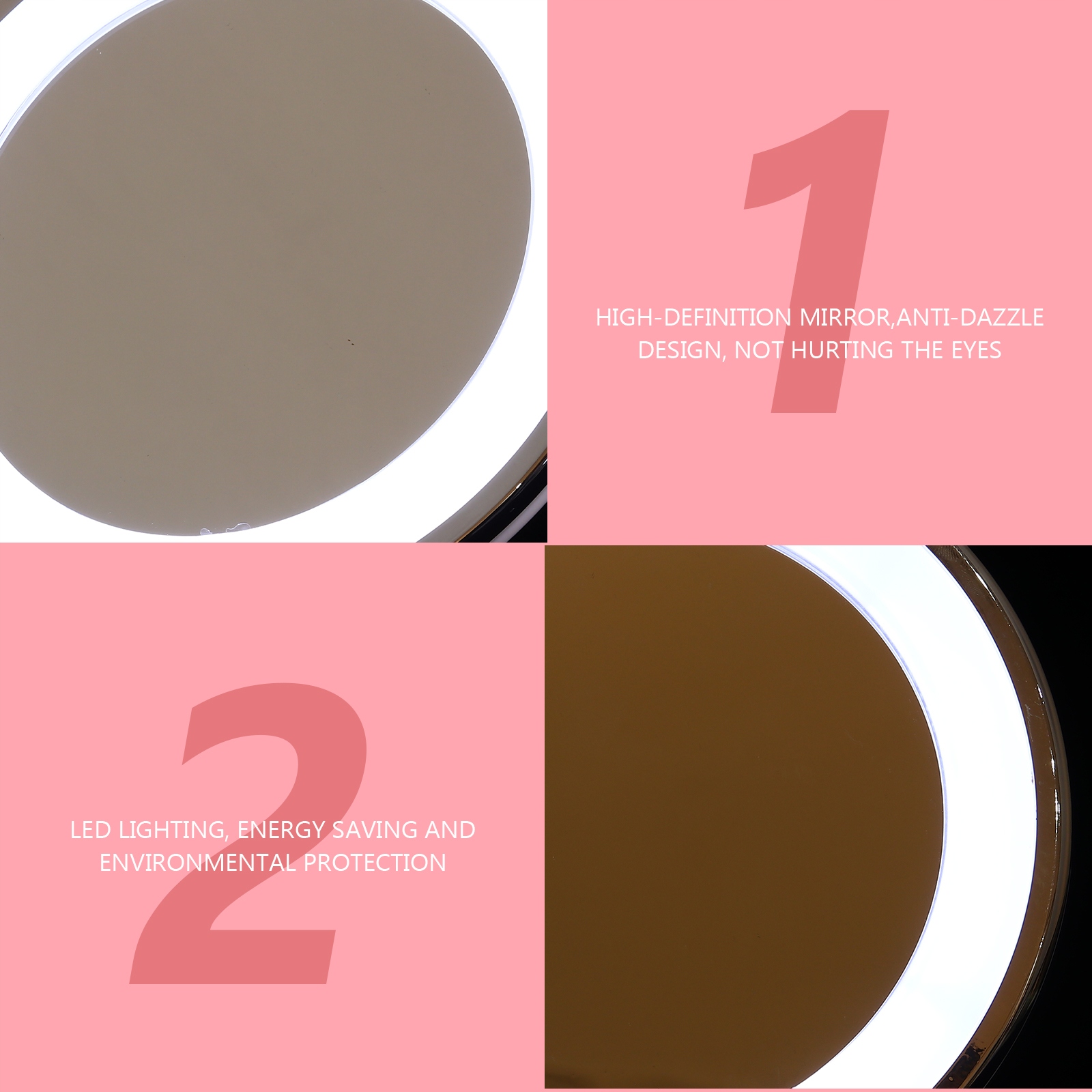 Это зеркало для макияжа оснащено светодиодной подсветкой. Стекло высокого разрешения более яркое и позволяет лучше отражать мельчайшие детали лица. Легко удовлетворить ваши различные потребности.