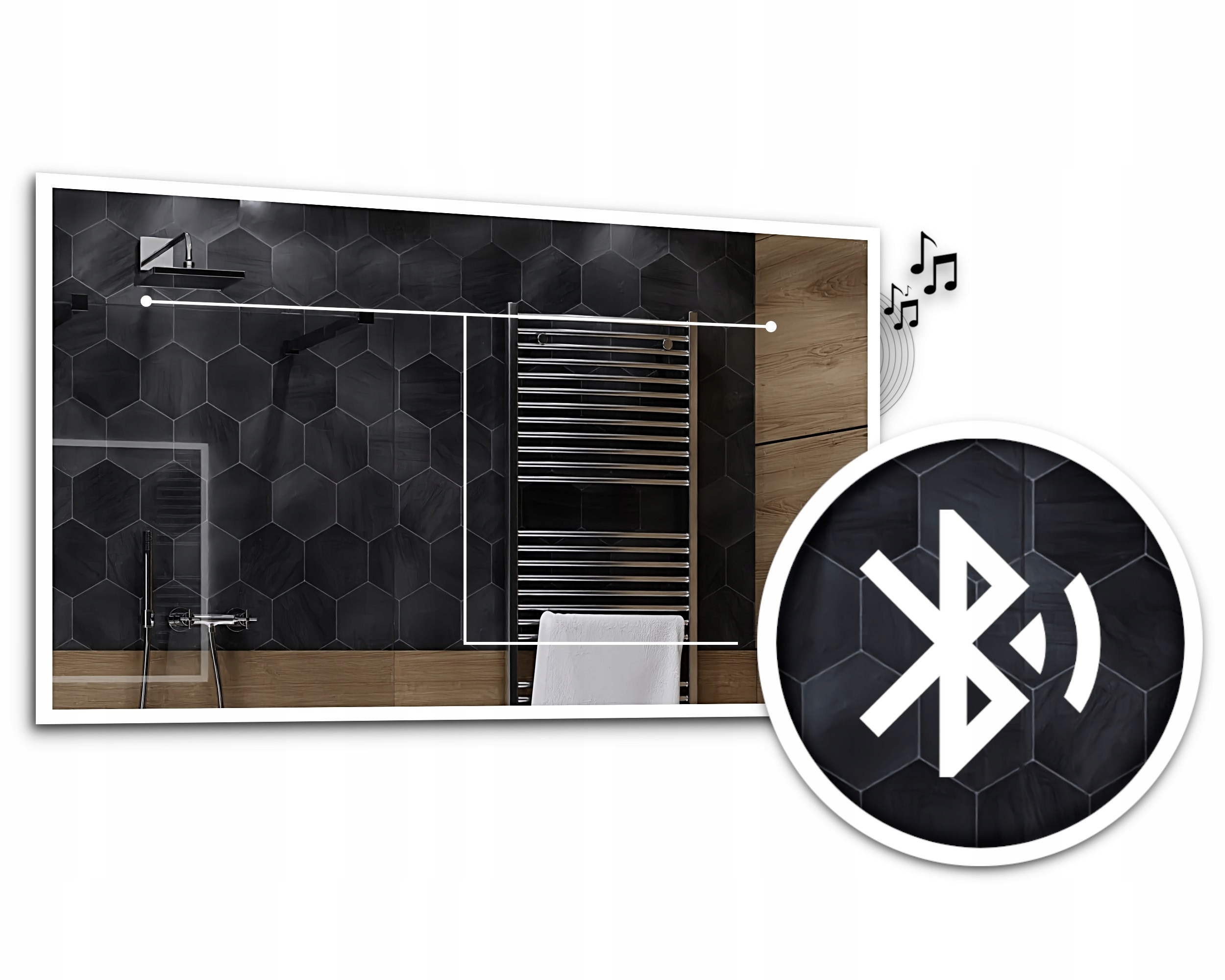 - Комплект из 2 стереодинамиков. За зеркалом установлены динамики, благодаря функции Bluetooth можно слушать любимую музыку в ванной. Подключение по Bluetooth на смартфоне, радиус действия до 10м.