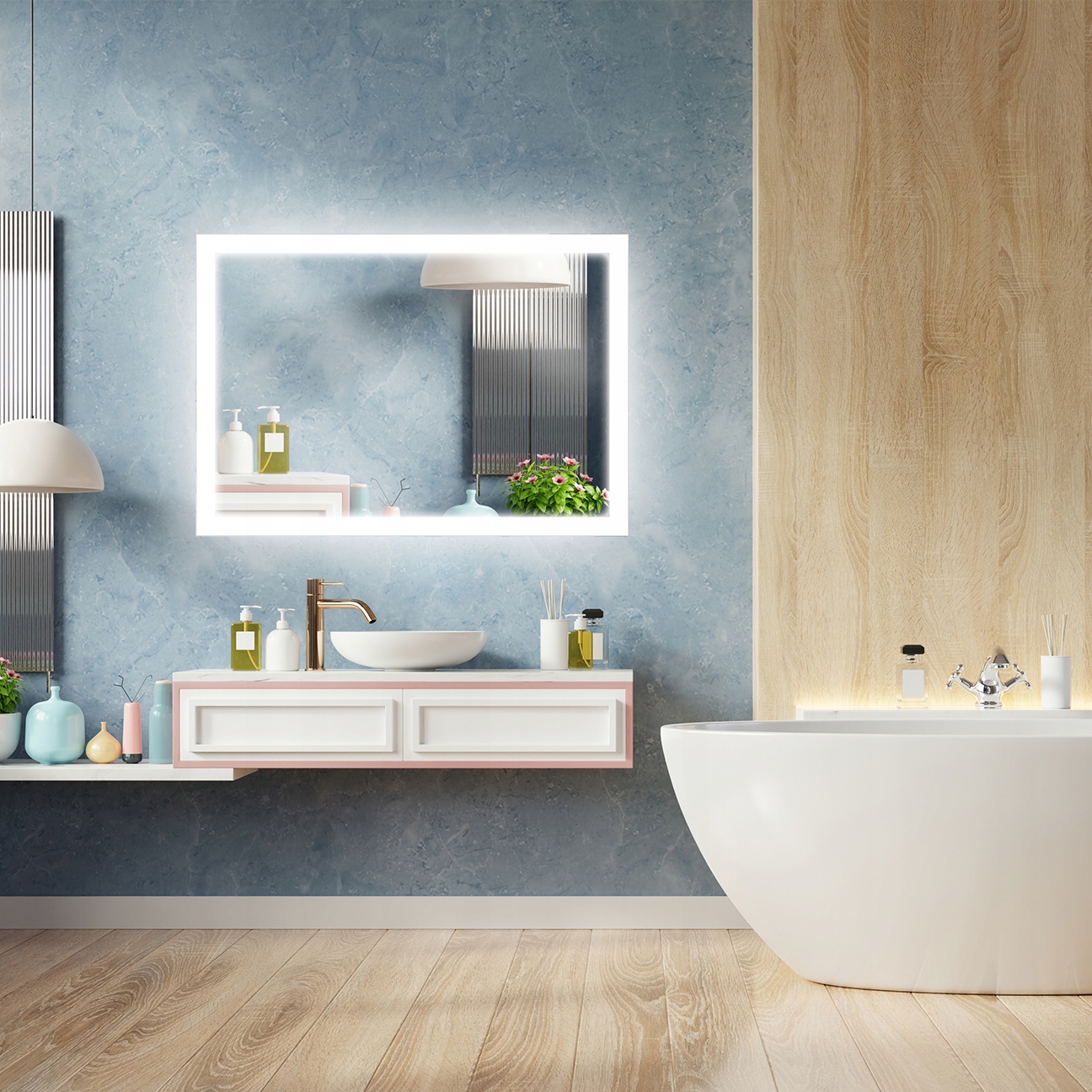 Чрезвычайно элегантное светодиодное зеркало со встроенной подсветкой внутри стекла со слегка уменьшенной длиной от линии края. Световые полосы, расположенные близко к центру зеркала, прекрасно освещают отражение и всю комнату, в которой они расположены. Зеркало прекрасно смотрится как в небольших помещениях, оптически увеличивая их своим отражением, так и в больших помещениях, где оно непременно станет одним из доминантных элементов декора.