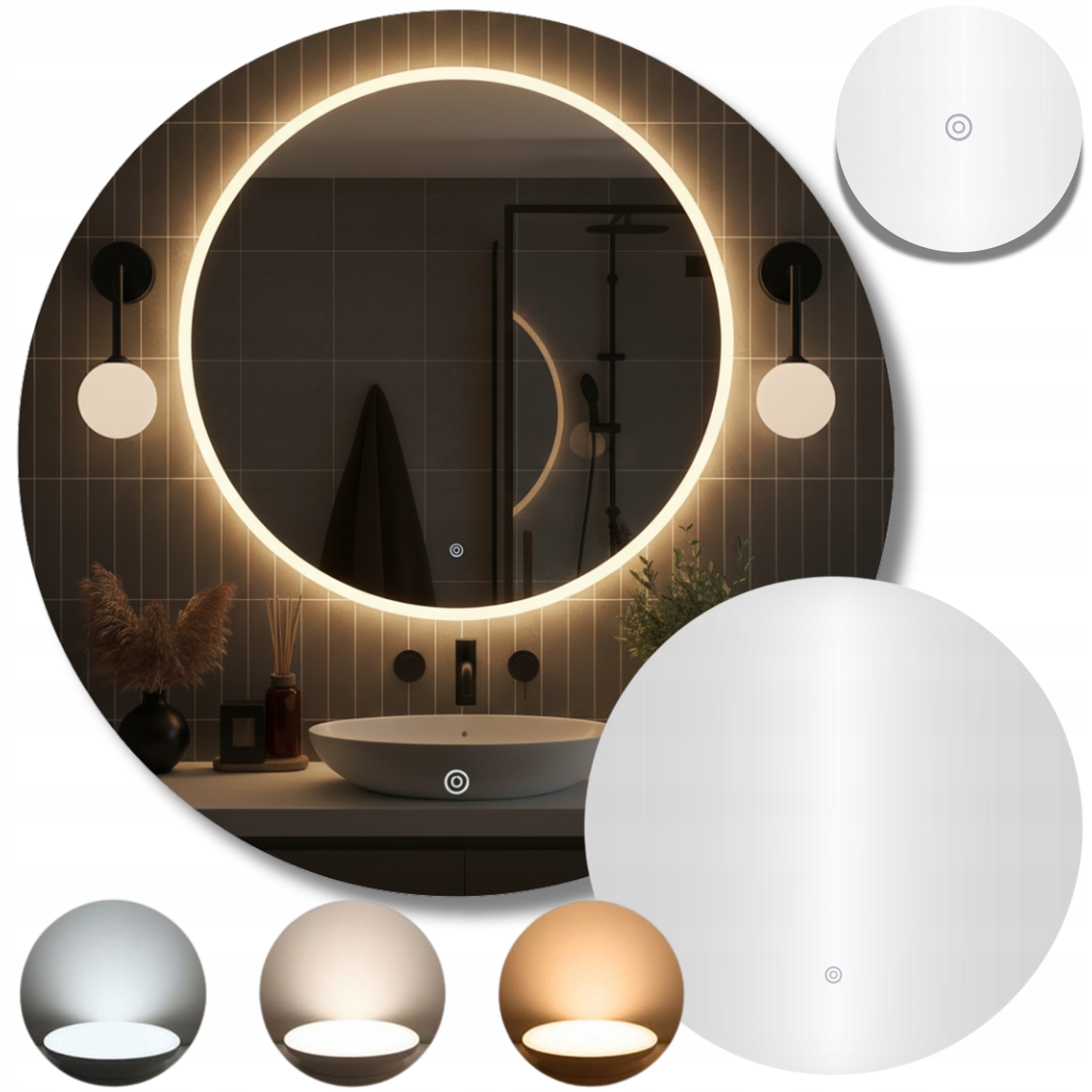 КРУГЛОЕ ЗЕРКАЛО СВЕТОДИОДНОЙ СВЕТОДИОДНОЙ 60 СМ ДЛЯ ВАННОЙ КОМНАТЫ С СЕНСОРНОЙ ПОДСВЕТКОЙ 3 ЦВЕТА СВЕТА