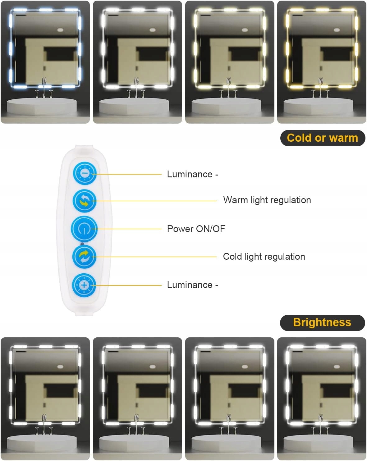 - 【Отличные 5 цветных режимов】 : профессиональный визажист участвует в отладке. 5 мод освещения (белый, натуральный белый, чистый белый, теплый белый, теплый желтый), 5 мод яркости. Нажмите кнопку +/-, чтобы выбрать другую яркость для регулировки. Интеллектуальная память означает, что эта светодиодная зеркальная лампа в голливудском стиле всегда останется на предпочтительном уровне яркости после последнего отключения