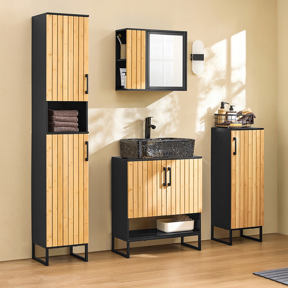 [Прочный и стильный дизайн]: Шкаф для ванной комнаты с зеркалом изготовлен из высококачественного МДФ и карканинизированного бамбука, сочетая долговечность с современной эстетикой. Добавляет изысканный акцент в ванную комнату или туалет, обеспечивая долгосрочную отделку.