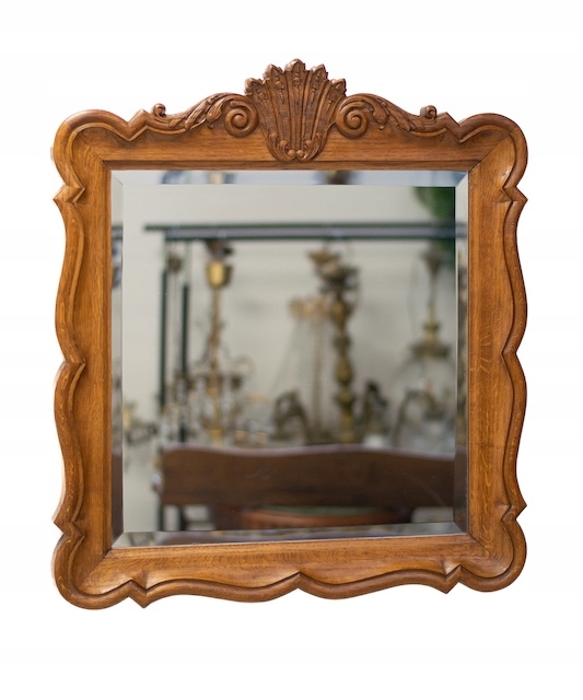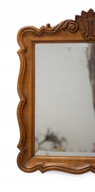 Зеркало в дубовой раме. Очень хорошо. Рамка красиво вырезана. Поверхность скошенная. Зеркало в хорошем состоянии. Повреждений и дефектов нет. Он готов к подвешиванию.