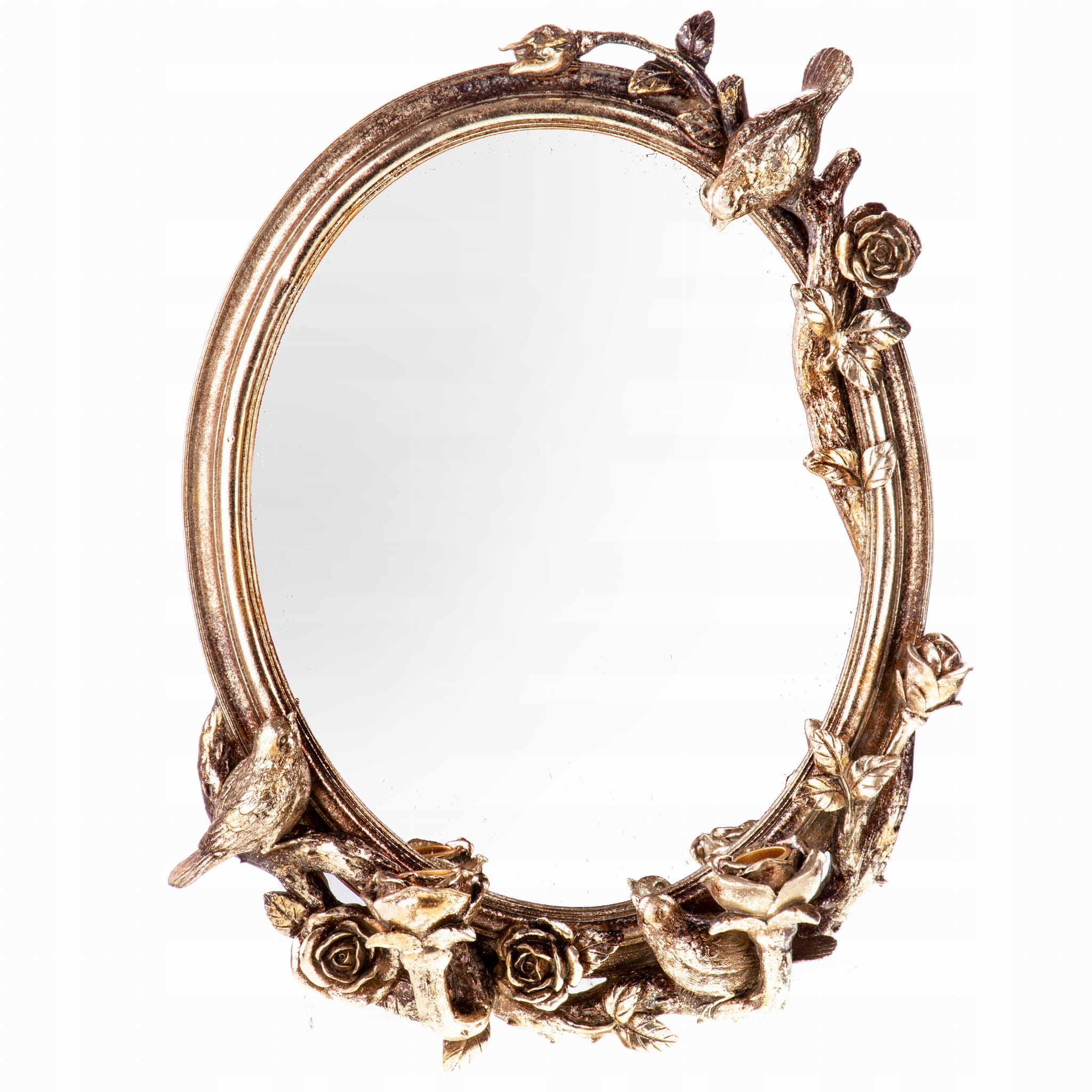 Это не обычное зеркало. Овальная форма с изящным декором в виде птиц и роз делает ее уникальной. Каждая деталь тщательно продумана, а античная отделка придает ей дополнительный шарм.