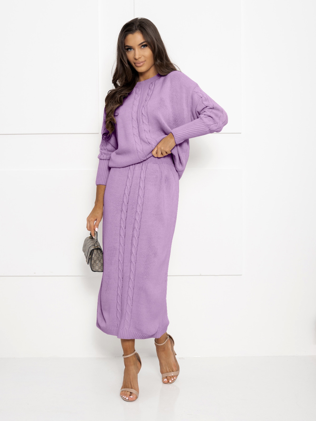 DZIANINOWY KOMPLET SWETER OVERSIZE DŁUGI RĘKAW MAXI SPÓDNICA - LILA