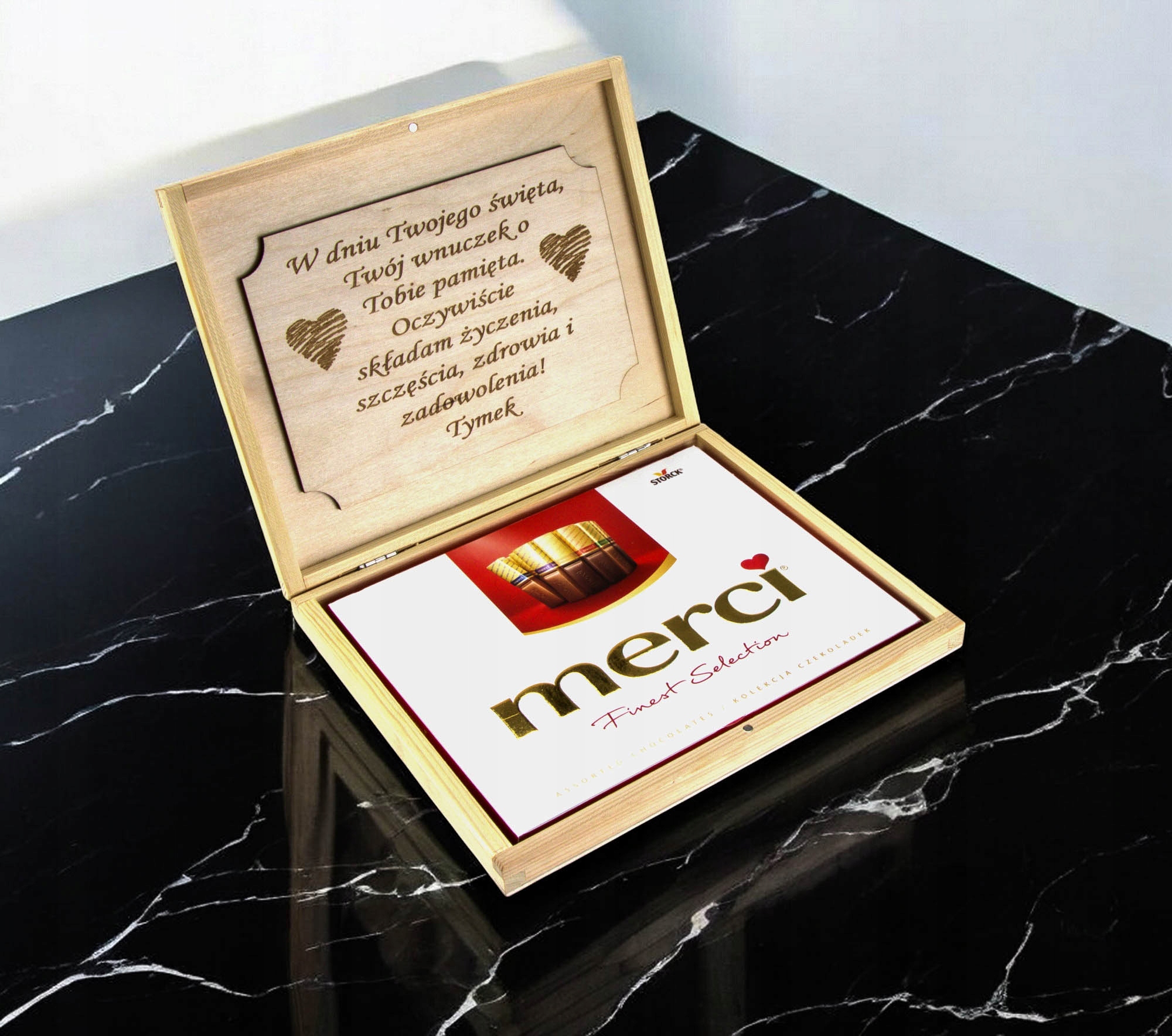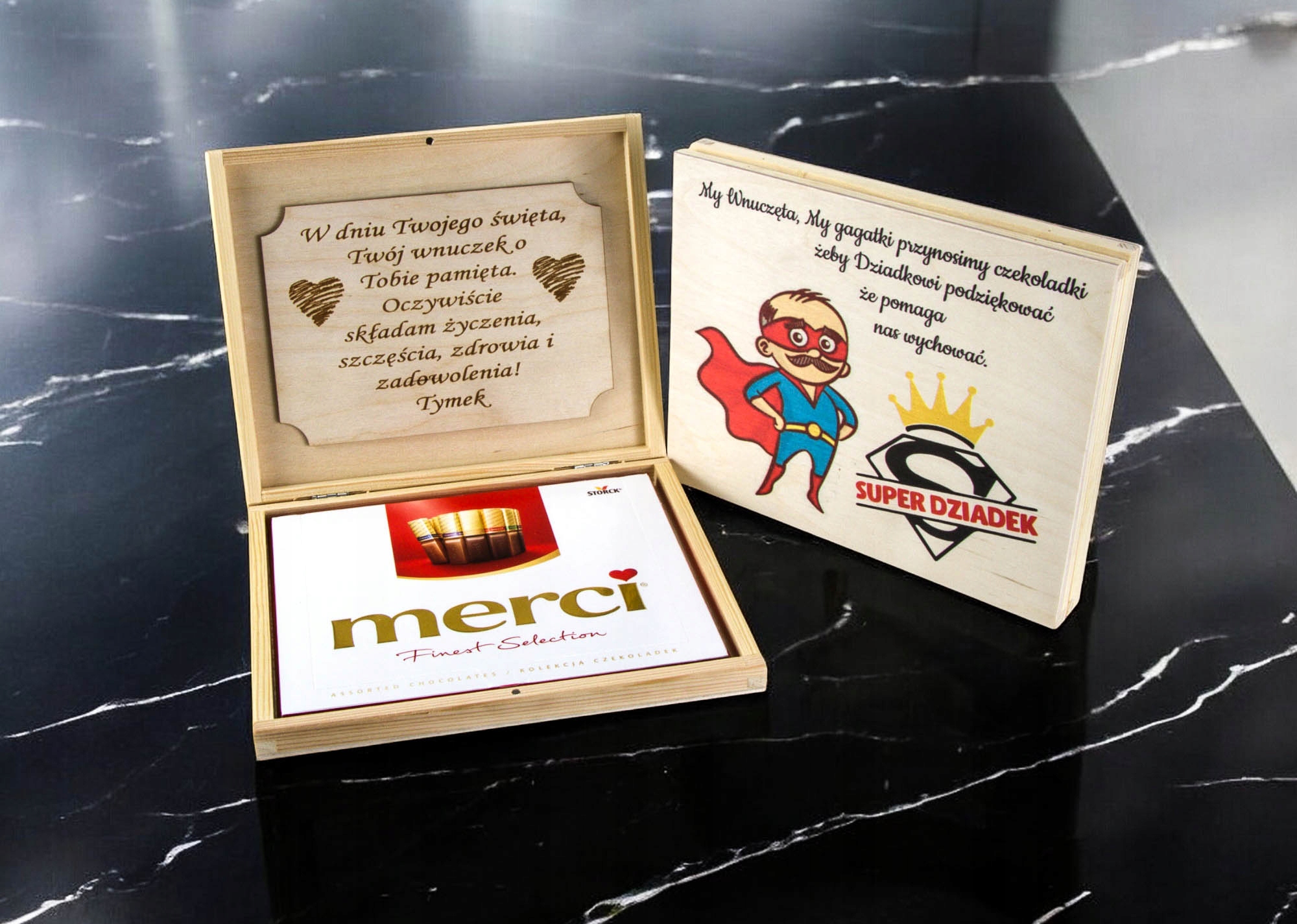 Dzień Babci i Dziadka GRAWER prezent pudełko drewniane na czekoladki Merci