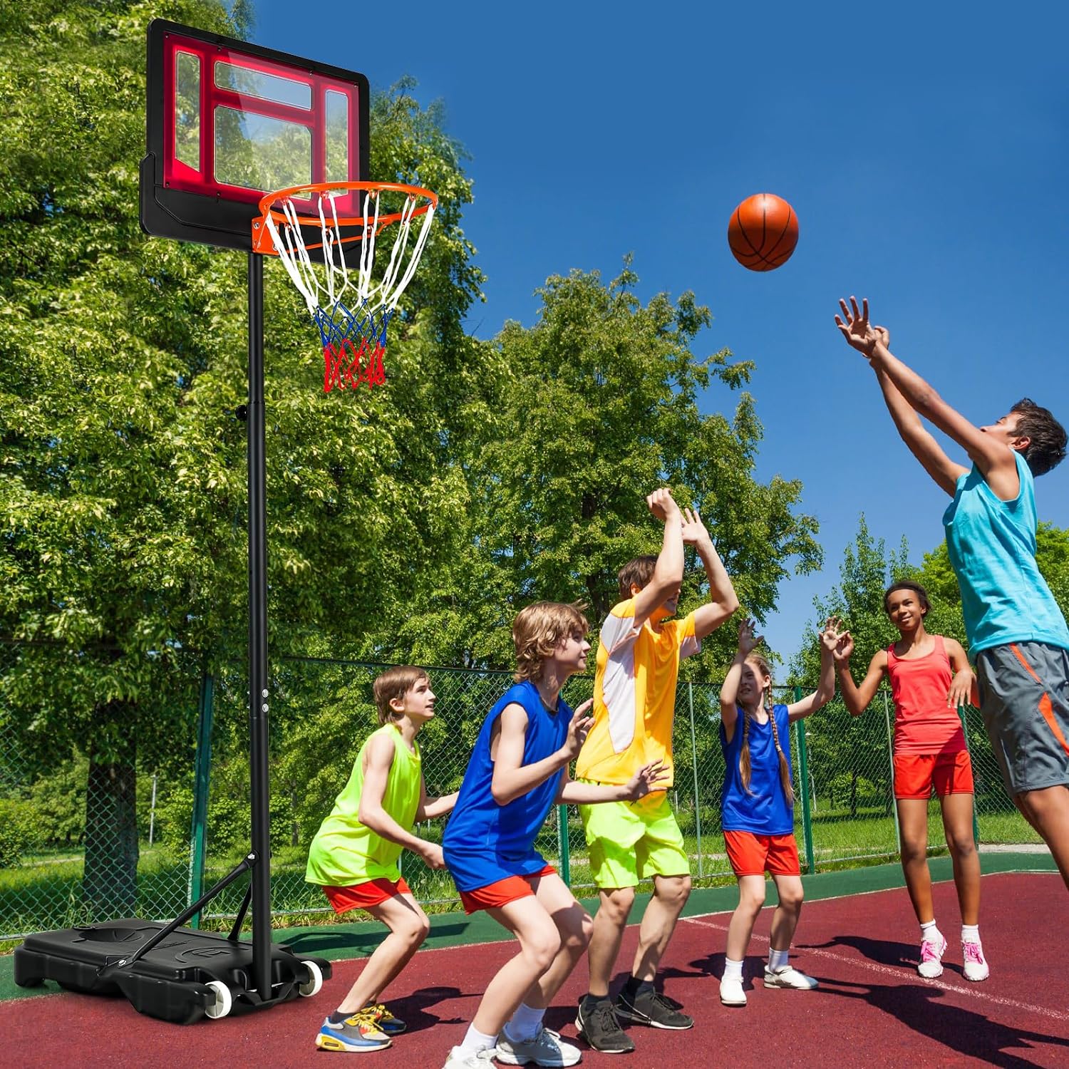 Десять баскетбольных стоек, состоящих из металлического каркаса с порошковым покрытием и высококачественной полипропиленовой сетки, подходящей для любых условий использования. Улучшенная задняя стенка из полиэтилена длиной 76 см отличается прочностью и ударопрочностью и выдерживает тысячи бросков без деформации.
