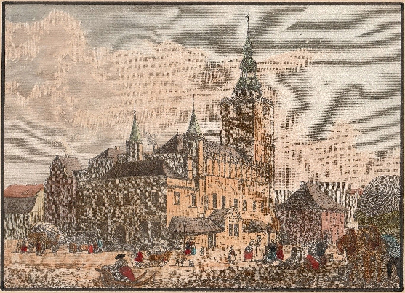 dzierżoniów. Rynek, -xix Age, Color Woodcut, просмотр размеров: ок. 115x80 мм, приклеенные passe -partout (размеры: около 300x240 мм), очень хорошее состояние.