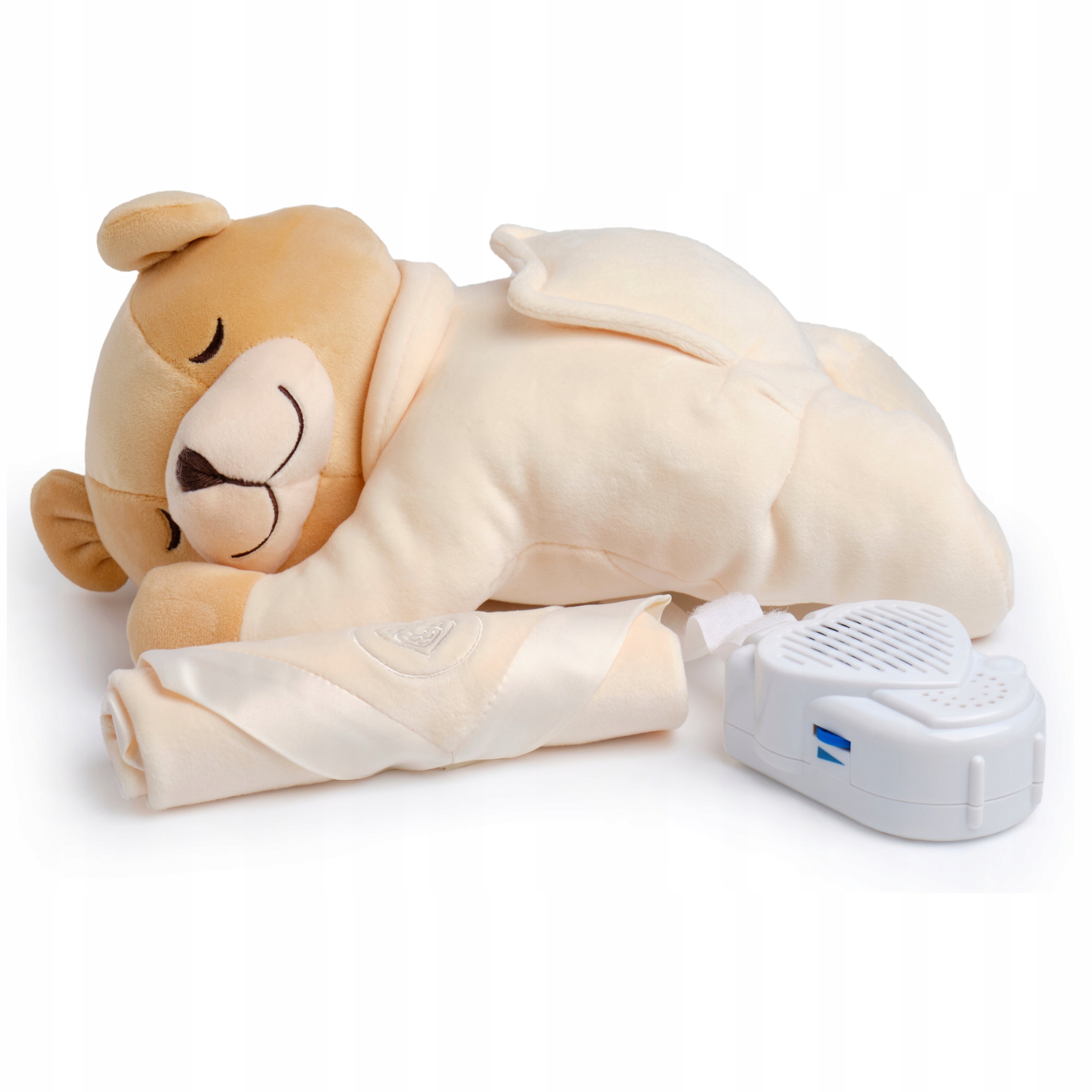 Устройство перезагружается, когда оно регистрирует голос ребенка (например, плач) или когда талисман перемещается (например, его ударяет ребенок) или ребенок сдвинет матрас). Звук снова начнет воспроизводиться в течение 5 минут. Звуковое устройство размещается на животе мишки, в специальном кармане на молнии. Их можно снять и прикрепить, например, к кровати.