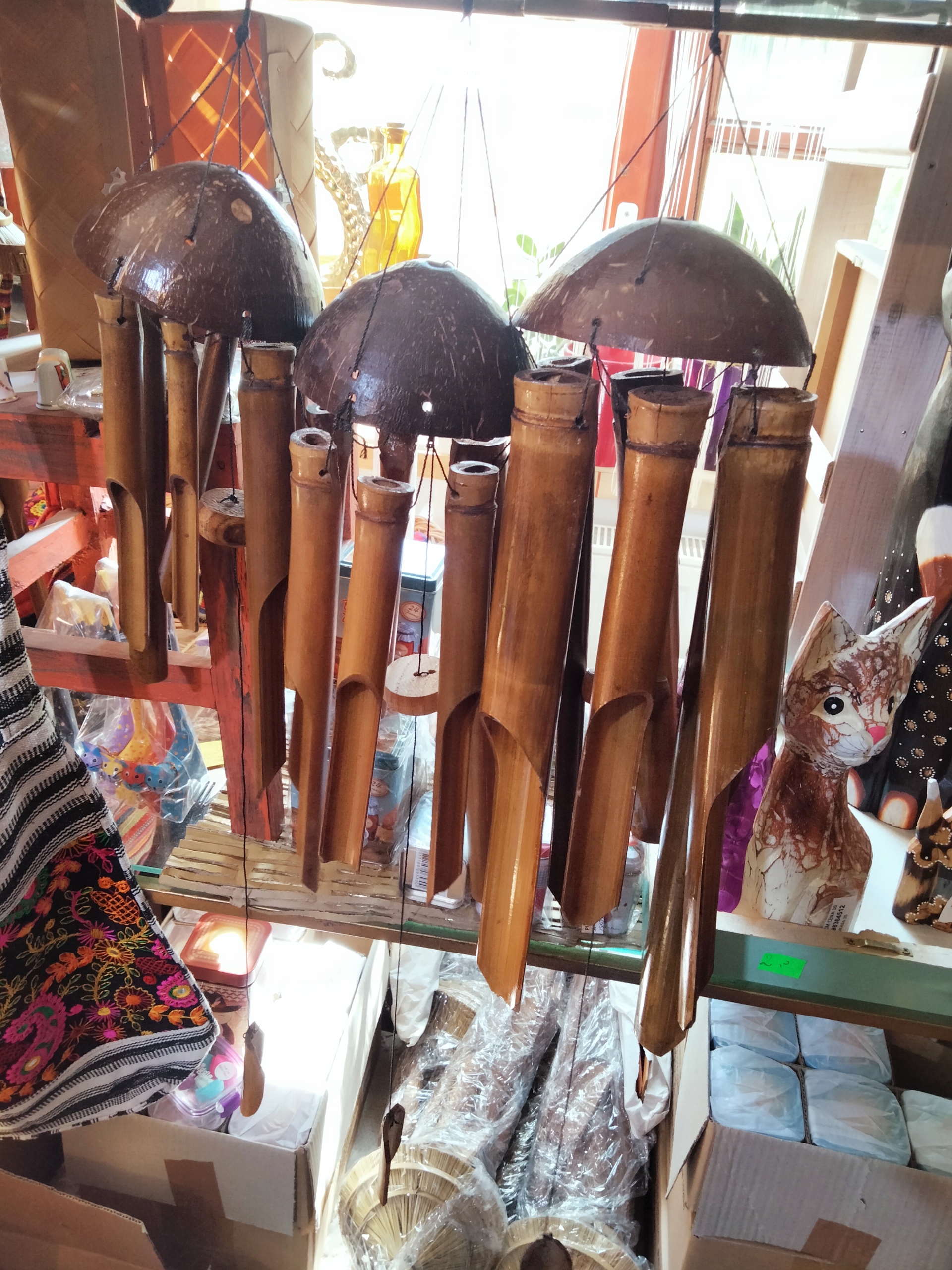 Оригинальные индийские бамбуковые колокольчики. Длина самой длинной трубки 30 см. Затем идет разрыв около 2 см и шляпка кокоса. Шляпы могут различаться по оттенку и форме, поскольку это индийское изделие, изготовленное из натуральных элементов. Общая длина 85 см. У них приятный звук.