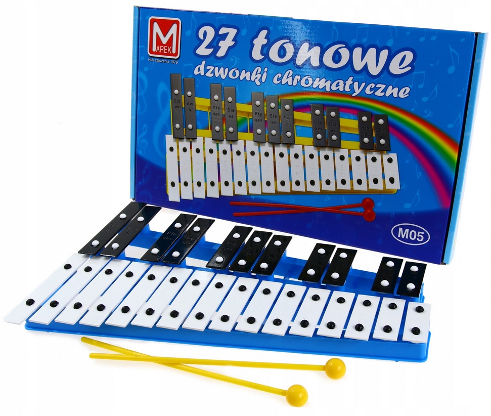 Игрушечный ударный музыкальный инструмент, состоящий из ряда металлических пластин. Игрушка, благодаря которой ребенок разучивает ноты и учится играть простые песенные мелодии с помощью двух палочек. Игра с хроматическими колокольчиками развивает у ребенка музыкальные способности и чувство ритма. (описание с коробки)