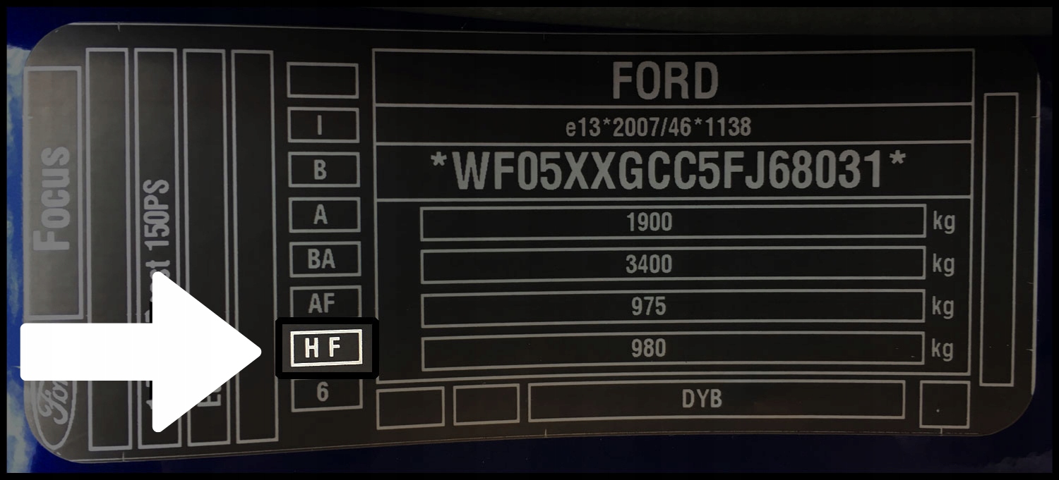 У компании FORD есть несколько мест, где может быть расположена цветовая маркировка. В случае с автомобилями выпуска до 2009 года серебристая металлическая пластина должна располагаться под капотом, возле балки или возле пассажирской двери. В автомобилях, выпущенных после 2009 года, ищите белую или черную бумажную наклейку возле пассажирской двери. Код цвета состоит из двух символов, расположенных во второй строке левого столбца снизу.