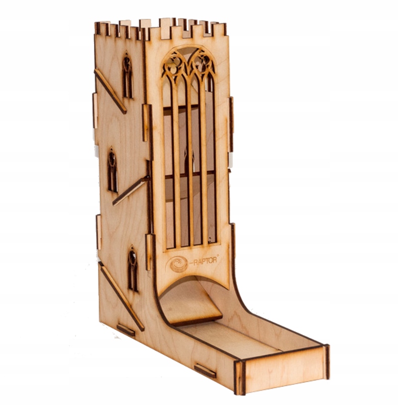 e-Raptor Dice Tower Castle Эта башня для игральных костей идеально подходит для настольных игр, действие которых происходит в средневековом/фэнтезийном мире. Достаточно крупный размер и уникальное оформление делают их похожими на настоящую замковую башню, что является идеальным украшением для темных досок.
