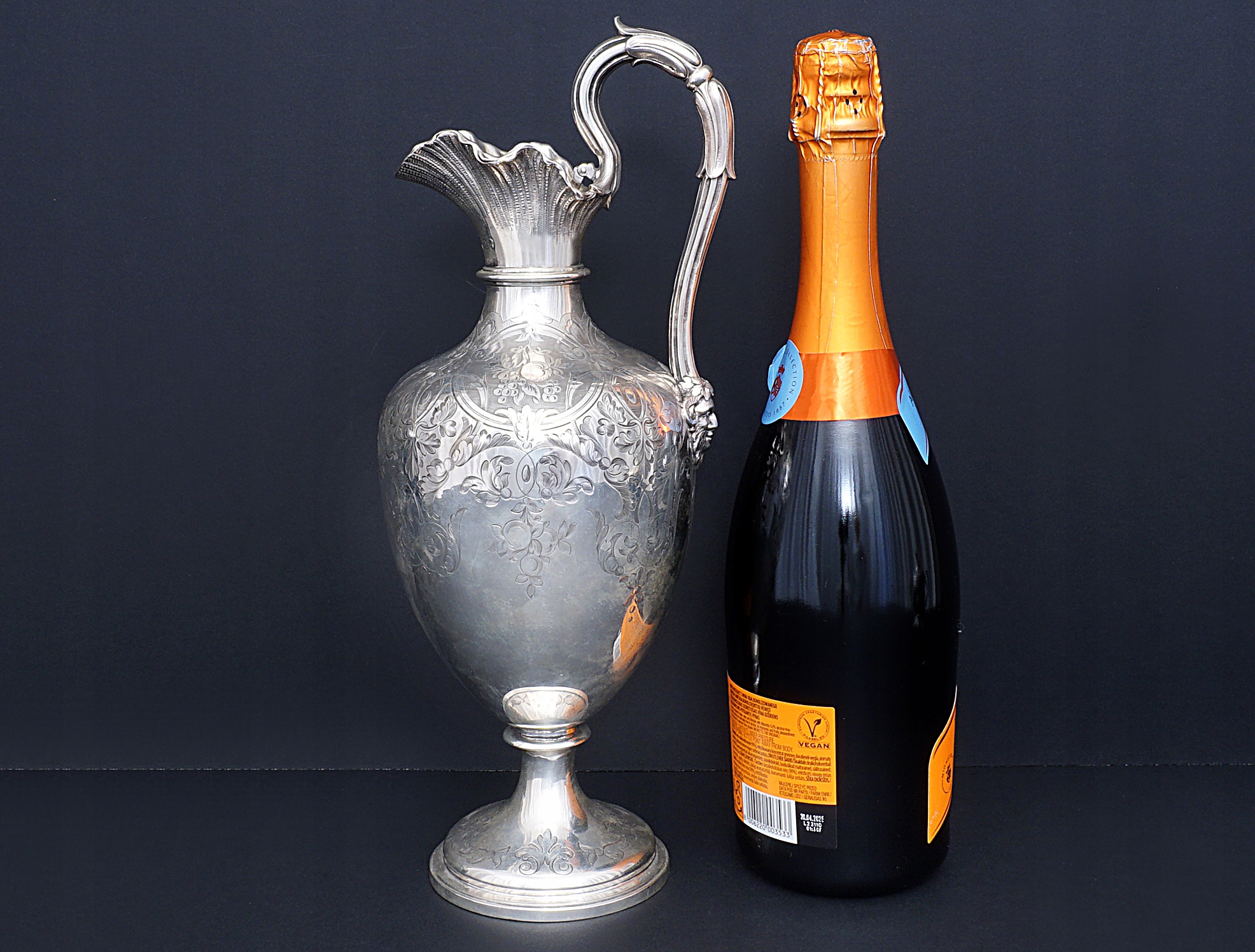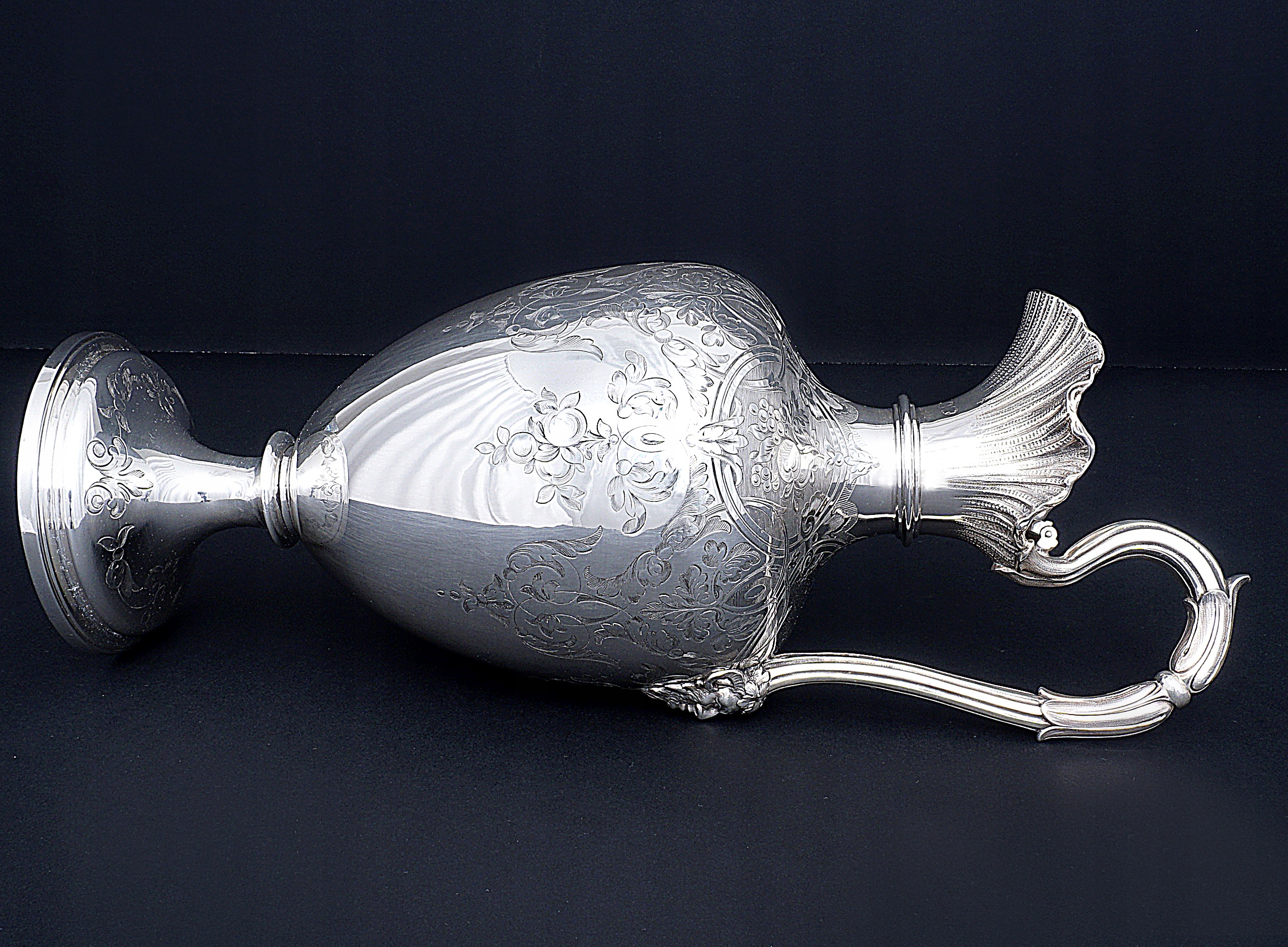 Высота кувшина 33 см. Вес нетто серебра 645 грамм.