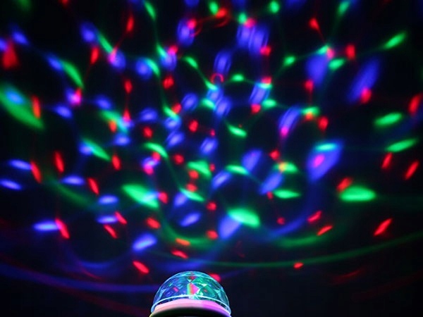 Лампа с вращающейся головой создает удивительные эффекты освещения в комнате. Красный синий и зеленый цвет меняется на преломление на стекле лампы