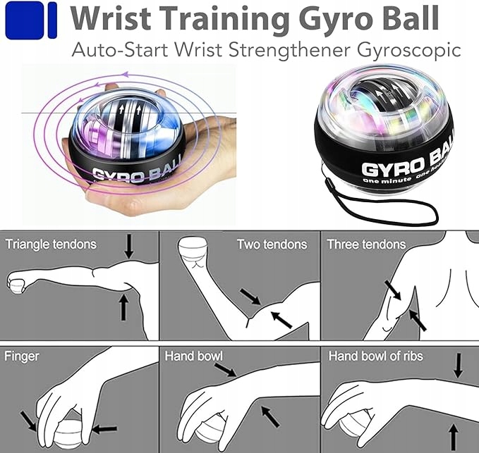- МОЩНЫЙ ШАР ДЛЯ ВРАЩЕНИЯ НА ЗАПЯСТЬЕ: Автоматически активирует систему. Операция очень проста: просто нажмите на сердечник в направлении стрелки, что активирует внутреннюю пружину. Во время тренировки следует носить специальный ремешок на запястье, чтобы не потерять его из-за чрезмерной силы.