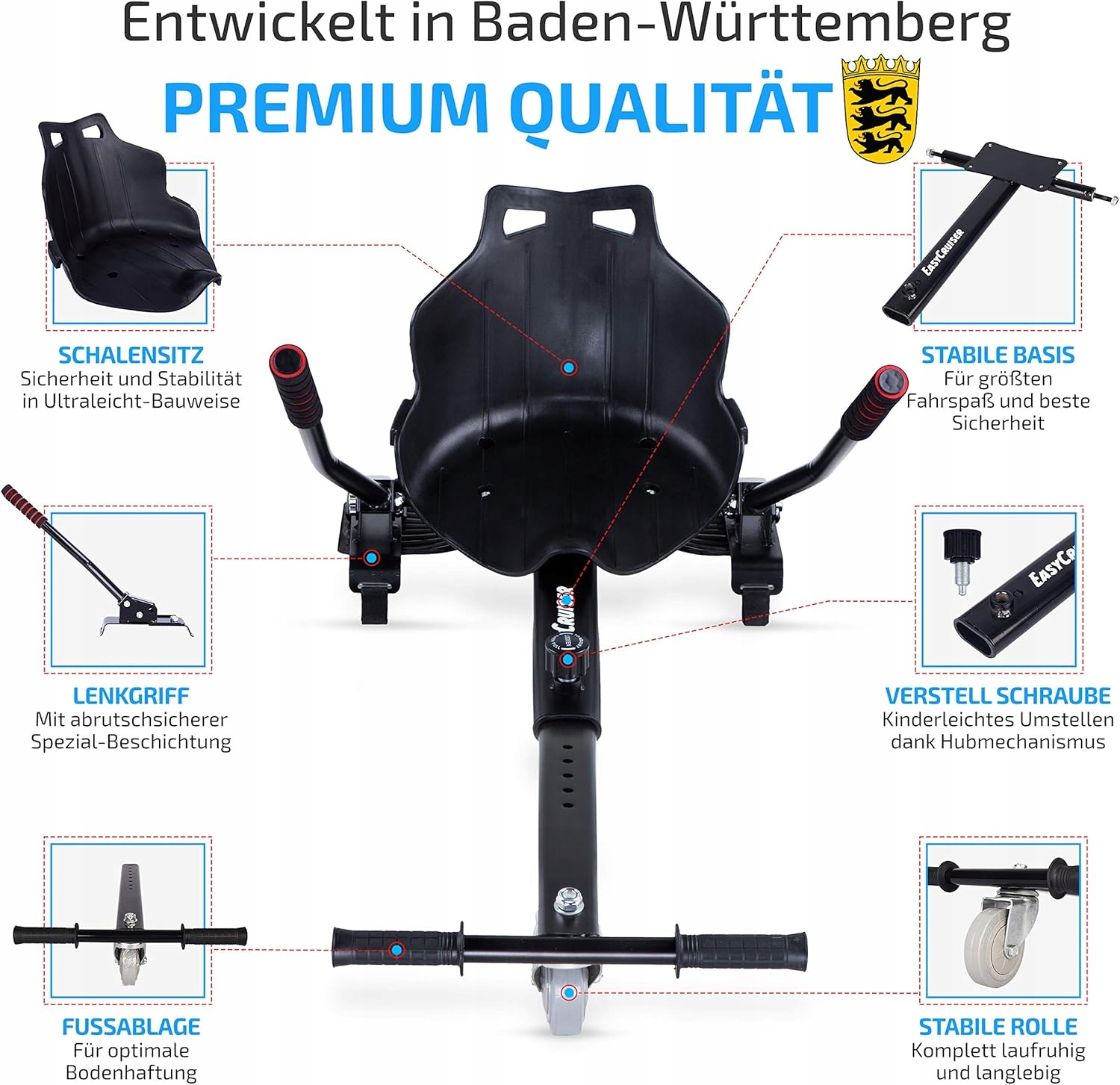 - Наше сиденье для ховерборда было разработано. с большой любовью и страстью в Германии. Наши стандарты качества гарантируют максимальное удовольствие от вождения и высочайший уровень безопасности.