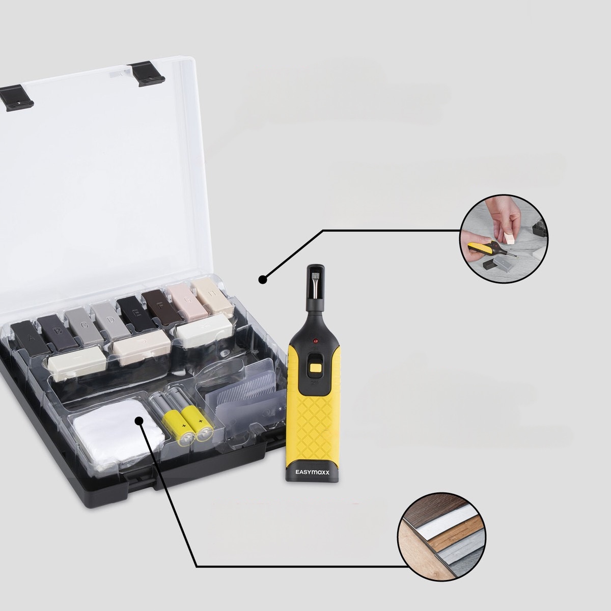С набором для ремонта ПВХ и винила EASYmaxx вы сможете быстро восстановить блеск поврежденных пластиковых поверхностей! Благодаря 11 цветам воска и простому в использовании устройству для его плавления ремонт дыр, царапин или вмятин становится быстрым и детской игрой.