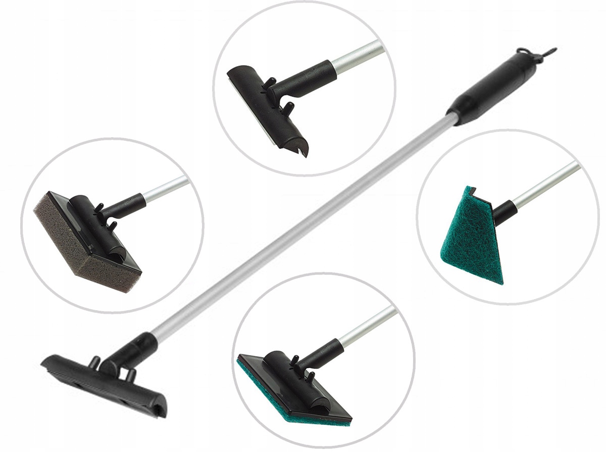 Простой в использовании скребок для аквариума. Имеет 4 насадки: мягкую губку, более жесткую губку, насадку для чистки углов аквариума и насадку-лезвие. Теперь каждый аквариумист может чистить все, что хочет и когда хочет. Оптимальная длина скребка 50 см делает его жестким и более долговечным, в отличие от поддельных чистящих средств с регулируемой длиной, которые ломаются в точке регулировки.