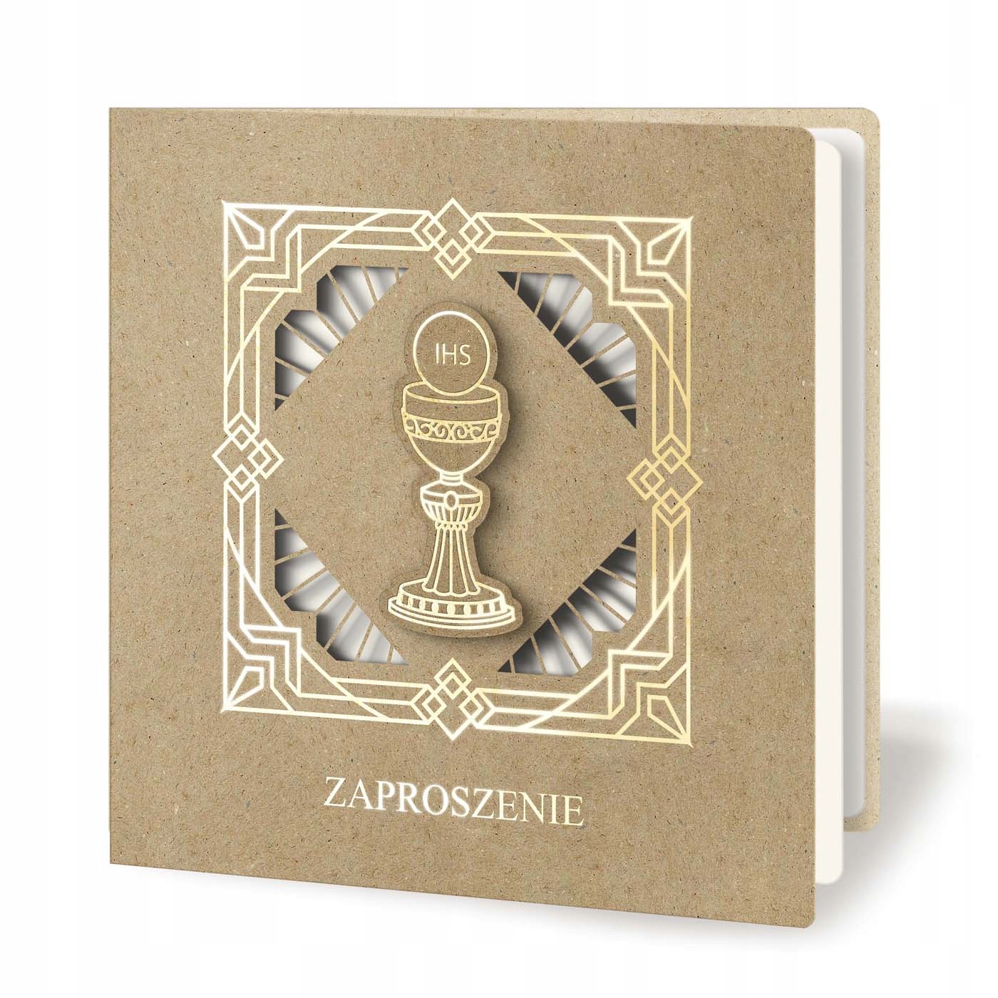 Приглашение на первое причастие с готовым текстом, который нужно написать. Текст внутри вкладыша универсален для девочек и мальчиков. Обложка изготовлена из 100% экологической, плотной коричневой бумаги KRAFT плотностью 350 г. На обложке золотой мотив и надпись «Приглашение». Лазерная резка выполняется с высочайшей точностью. Вкладыш выполнен из матовой бумаги цвета экрю, плотностью 120 г. Обложка и вкладыш имеют закругленные углы.