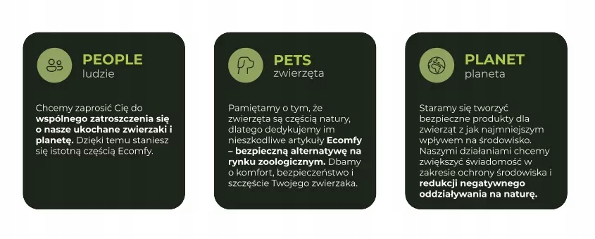 <ул>Мы сами создаем изделия Ecomfy – от дизайна до производства на собственных фабриках, расположенных в Сувалках и Варшаве. Наша продукция основана на натуральных материалах, переработанных смесях и сырье, полученном при производстве. 3P Система ценностей Ecomfy определяется тремя P — людьми, животными (домашними животными) и планетой.