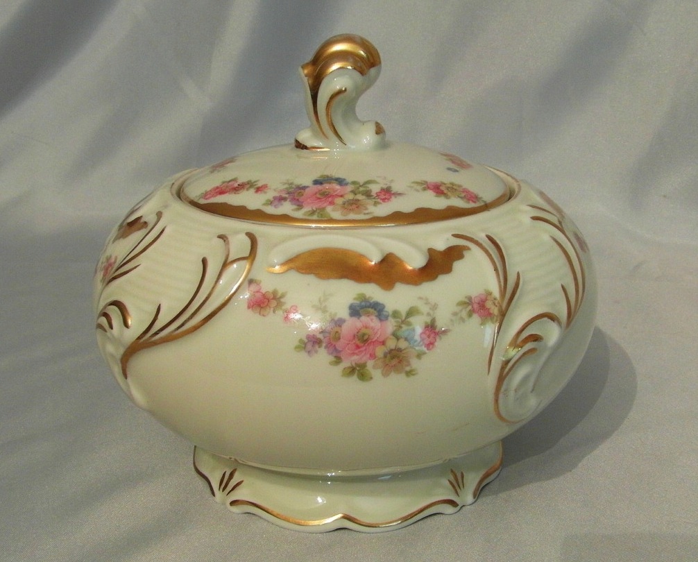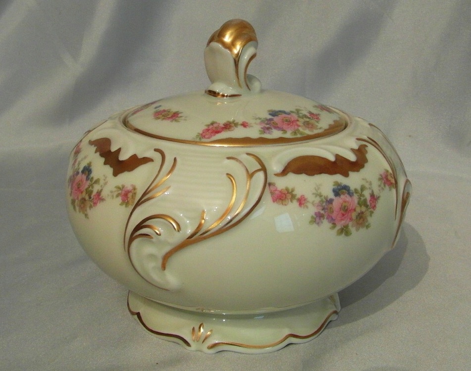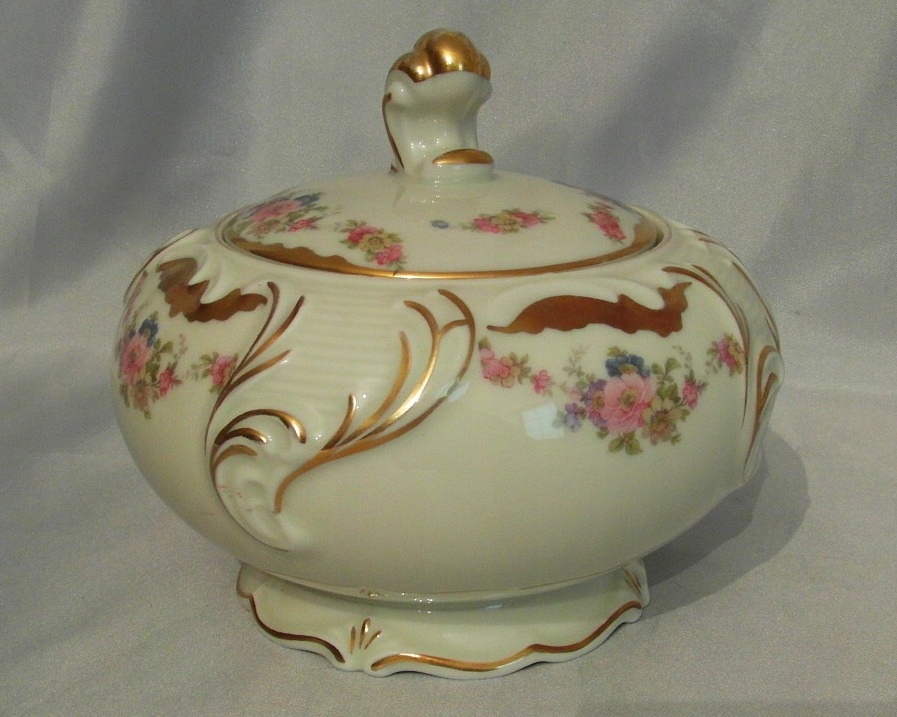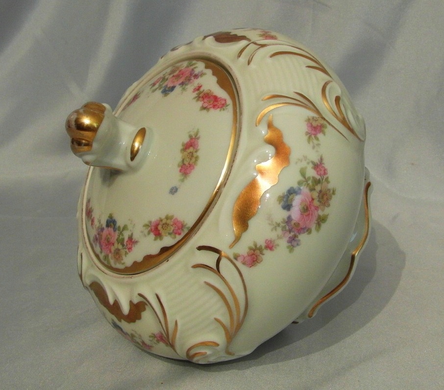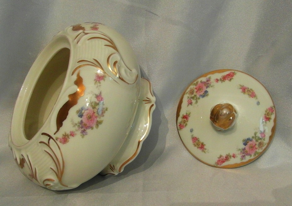 Кремовый, прекрасно лепной фарфор, богато украшенный позолотой и яркими цветочными композициями.
