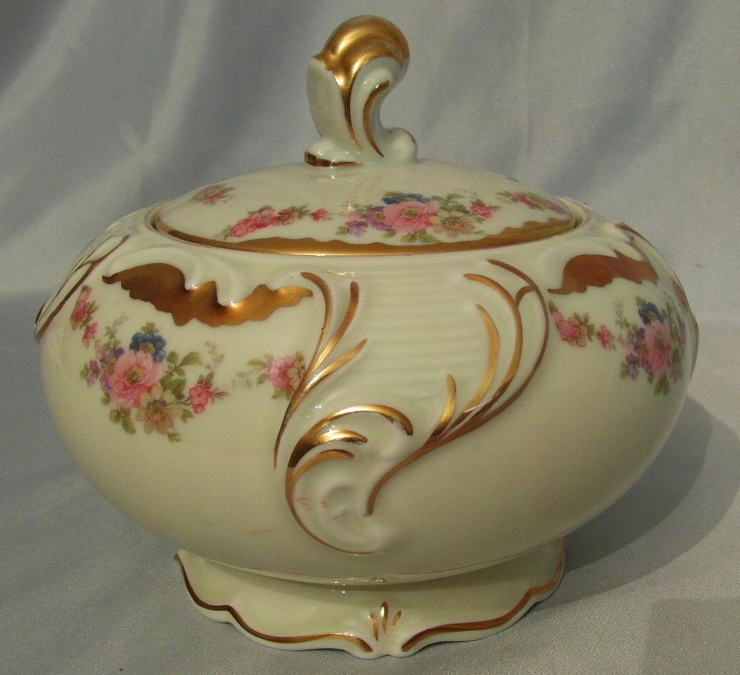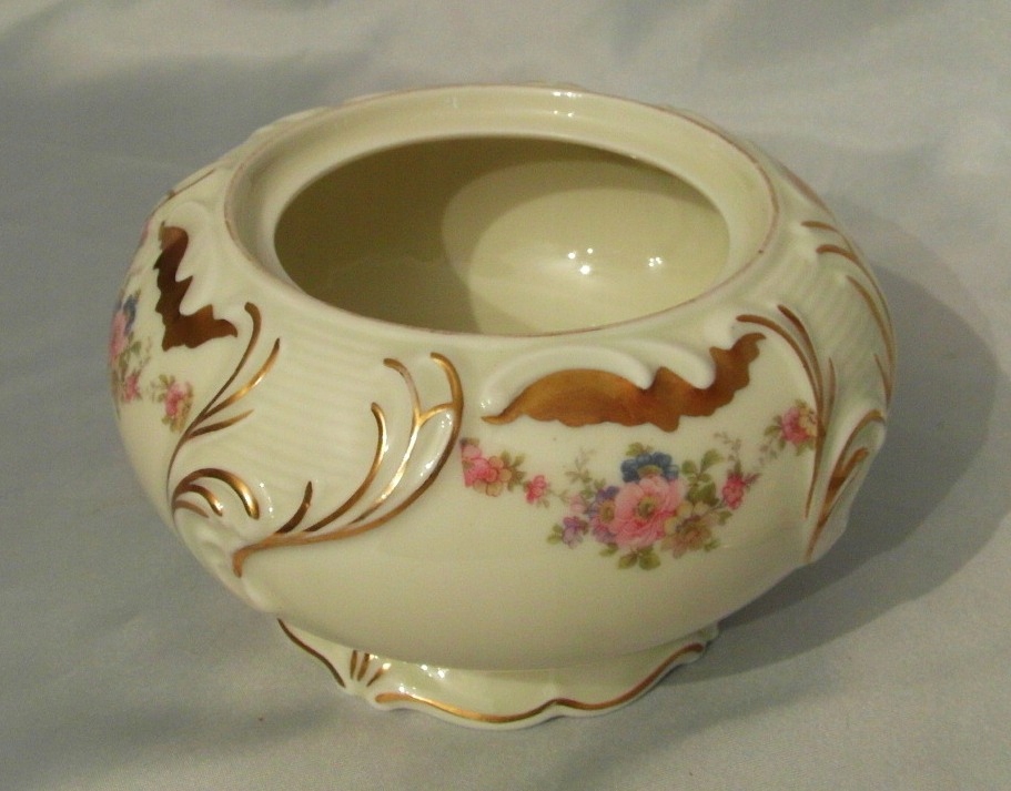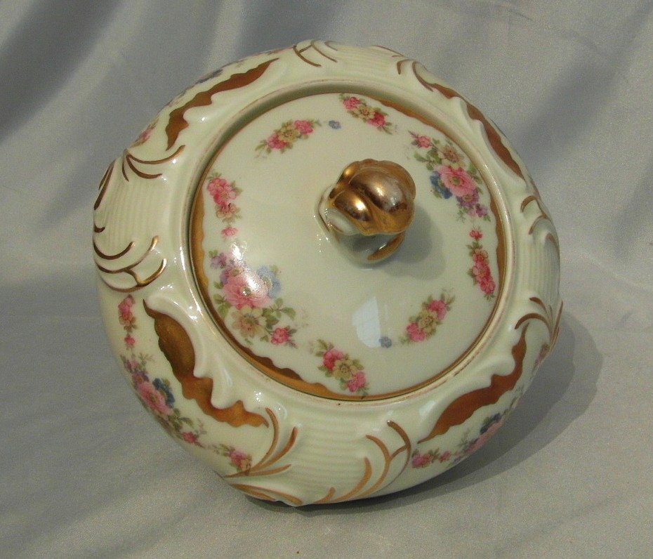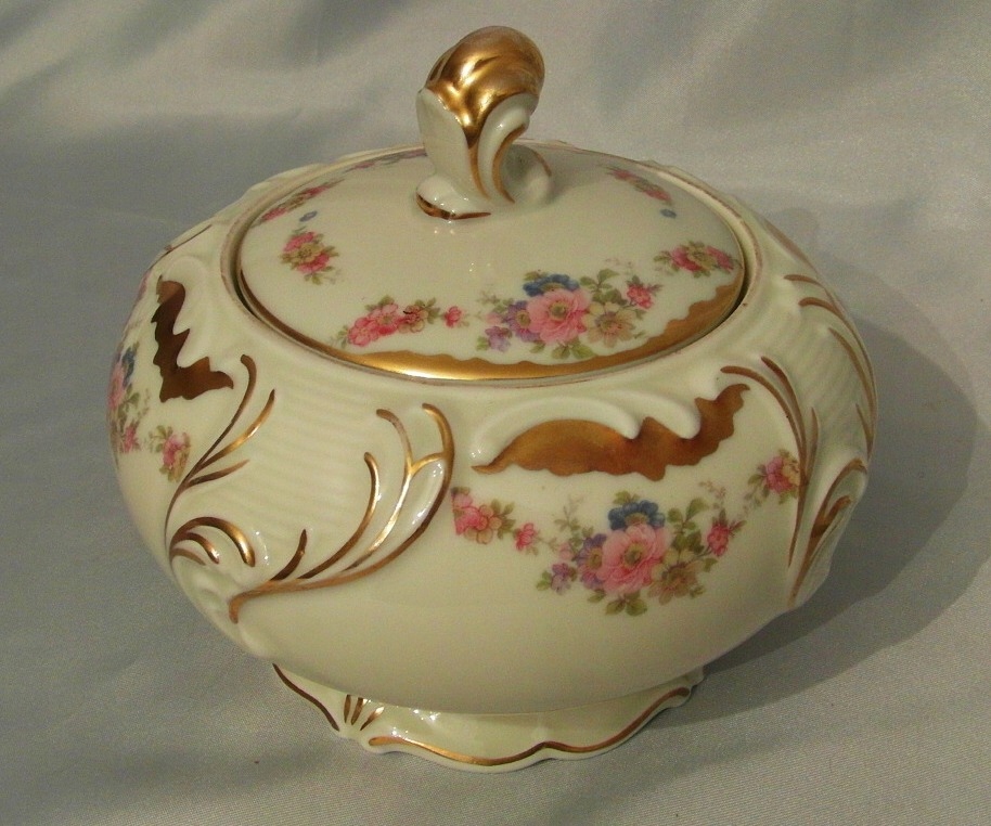 Кремовый, прекрасно лепной фарфор, богато украшенный позолотой и яркими цветочными композициями.