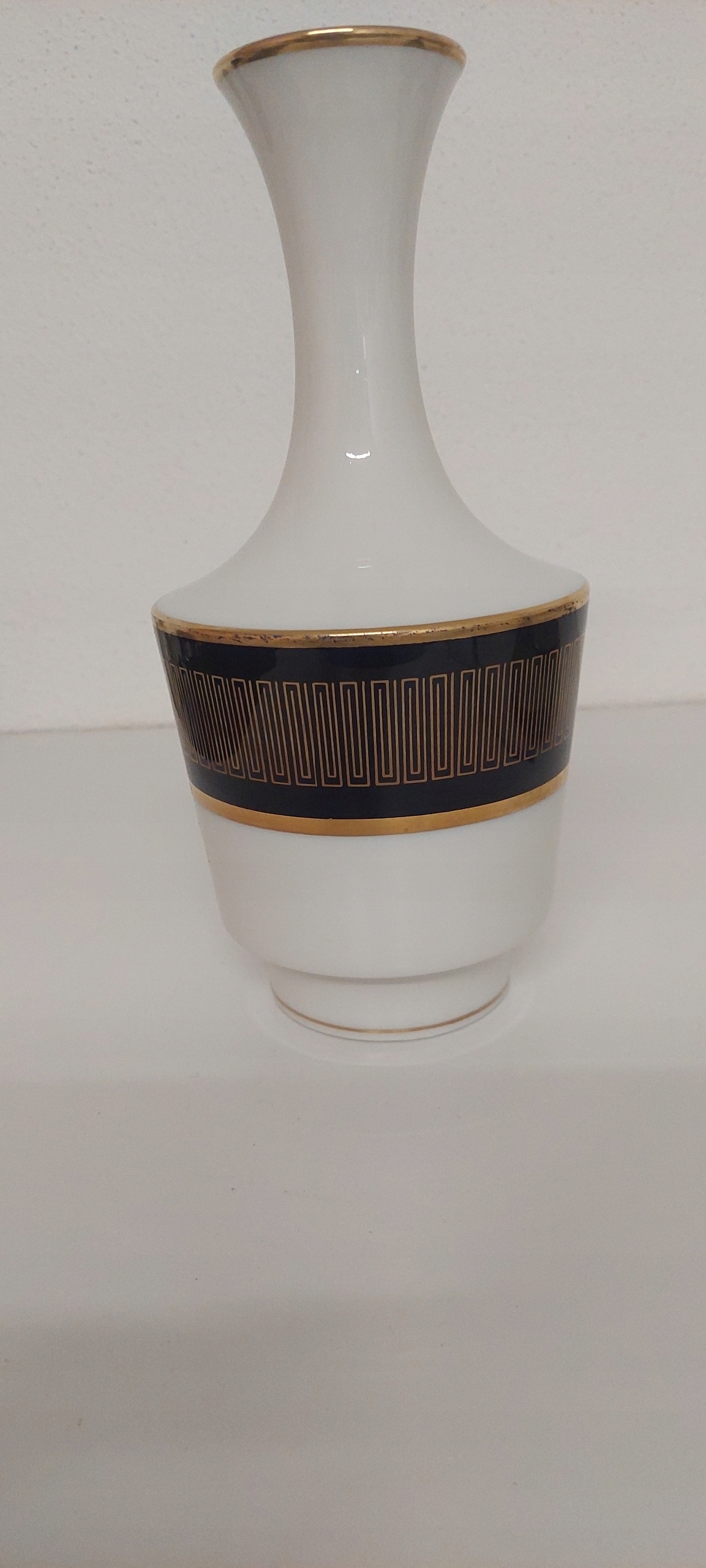 ваза с высотой размеров 23,5 см, диаметр заполнителя 5,5 см. Ваза имеет минимальное позолование в ремне, видимое на фотографии.