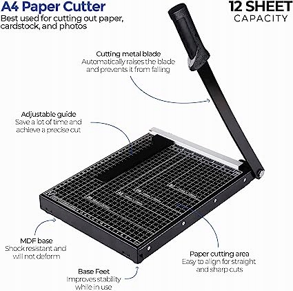- 🆗 Multifunctional: гильотина, способная резать ламинированную бумагу A4, A5, B6, B7, фотографии, фольга и картон. Возможность разрезания до 12 листов бумаги одновременно.