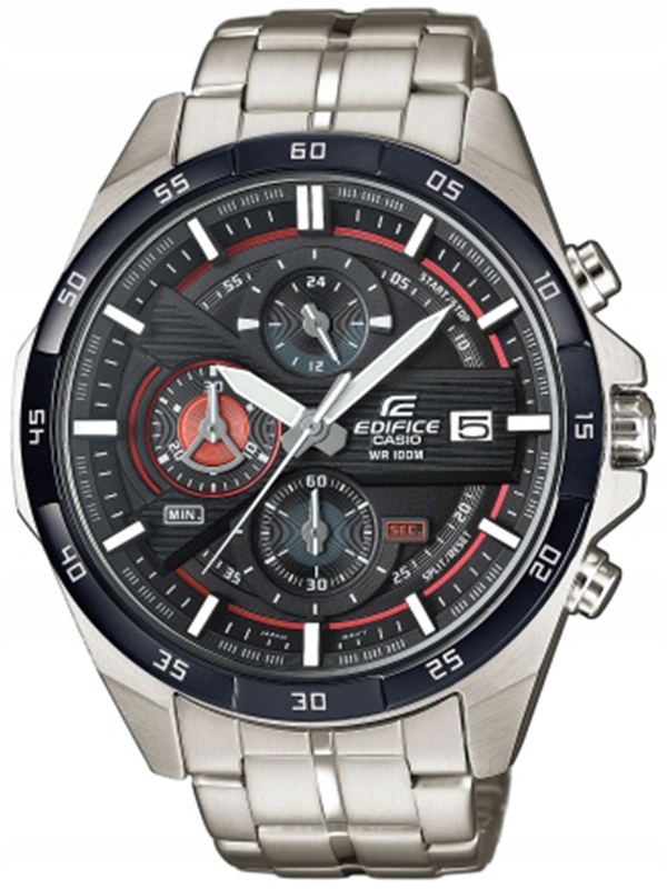 Casio Edifice EFR-556DB-1AVUEF – мужские спортивные часы с интересным дизайном, привлекающим внимание. Корпус диаметром 48,5 мм и толщиной 12,6 мм, а также браслет с цельными звеньями изготовлены из высококачественной стали, устойчивой к коррозии. В этой модели используется очень устойчивое к разрушению минеральное стекло. Темный циферблат с красными вставками имеет большие, разборчивые индексы, поэтому прочитать время не составит труда. Индексы и стрелки имеют флуоресцентный слой, позволяющий считывать время в темноте. Кроме того, секундомер с точностью до 1 секунды делает часы пригодными для занятий спортом. Класс водонепроницаемости 100М допускает свободный контакт с водой, например, во время плавания.