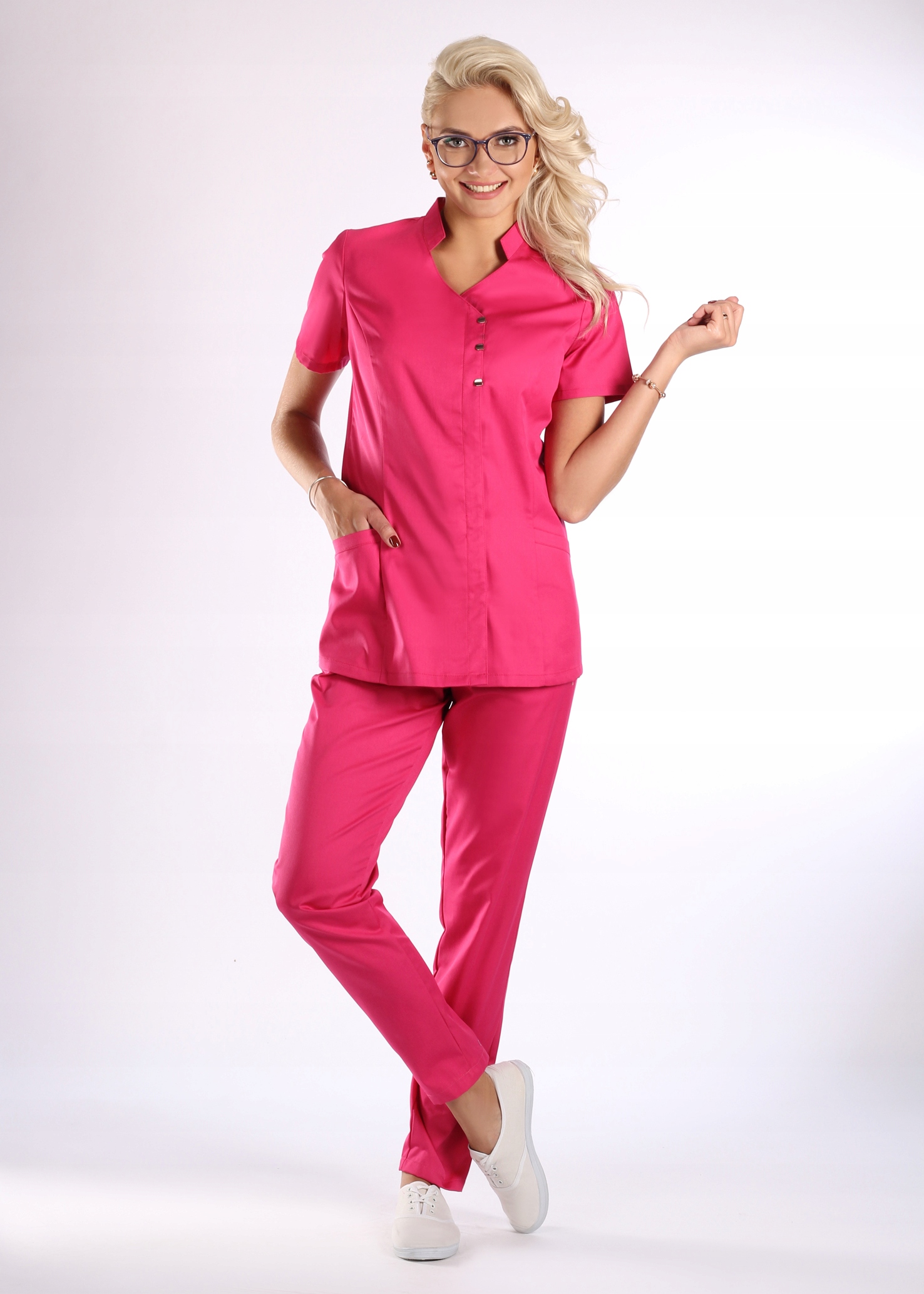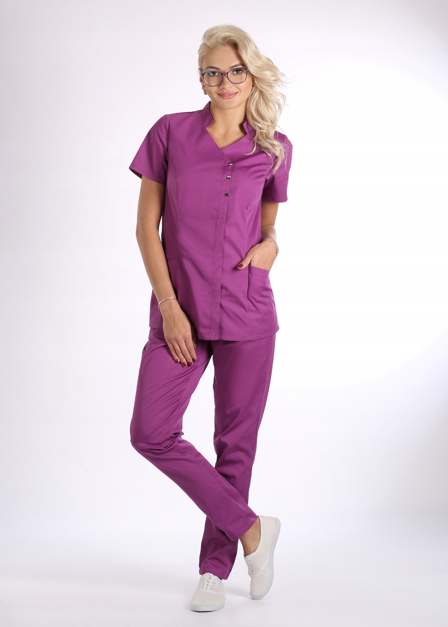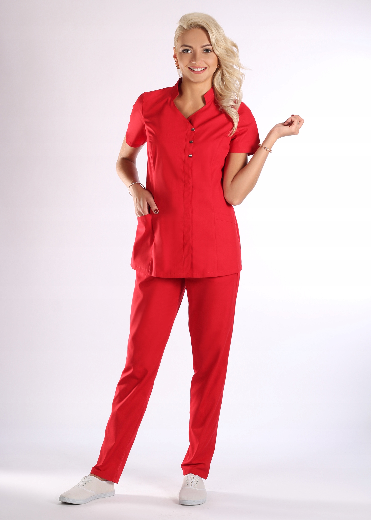 Медицинская или косметическая куртка лучше всего в сочетании с узкими брюками. Есть 3 декоративные застежки, остальные спрятаны под вертикальной утягивающей планкой. Французские вырезы спереди, моделирующие женский силуэт. Два кармана (здесь мы предлагаем разместить логотип компании или персонификацию из флока.