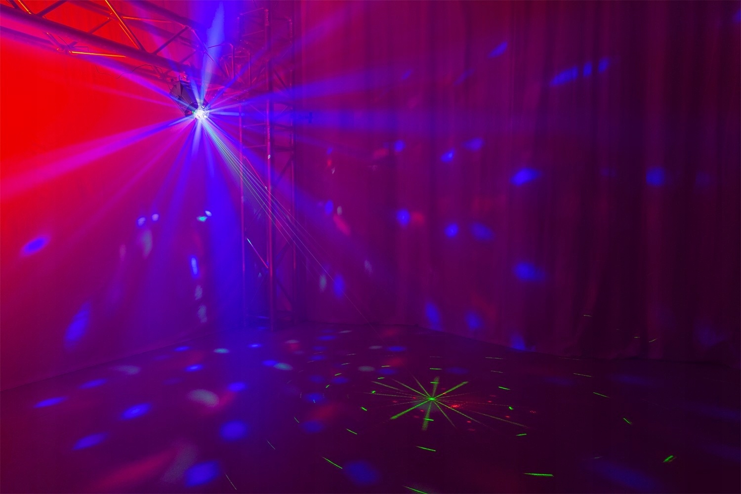 Max DJ10 оснащен эффектом Jelly Moon, обеспечивающим различные световые эффекты в сочетании с мощным красным и зеленым лазером. Jelly Moon создает заполняющие пространство красочные движущиеся лучи, которые питаются от трех светодиодов красного, зеленого и синего цвета. Два лазера создают звездное небо с фигурами и тысячами мерцающих красных и зеленых лазерных точек. Благодаря автоматической программе этот светильник идеально подходит для вечеринок, баров, дома и т. д.
