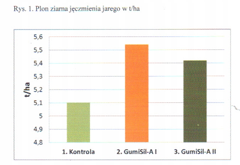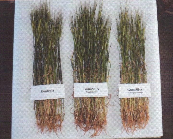 Стимулятор роста ГумиСил-А, независимо от азотных удобрений, повышал урожайность зерна по отношению к урожайности зерна растений из пункта управления, где он не использовался. Положительная реакция растений на стимулятор в отношении полученного урожая была выше во втором контроле. Однако на третьем контроле, несмотря на снижение азотных удобрений на 25%, была заметна небольшая прибавка урожайности.