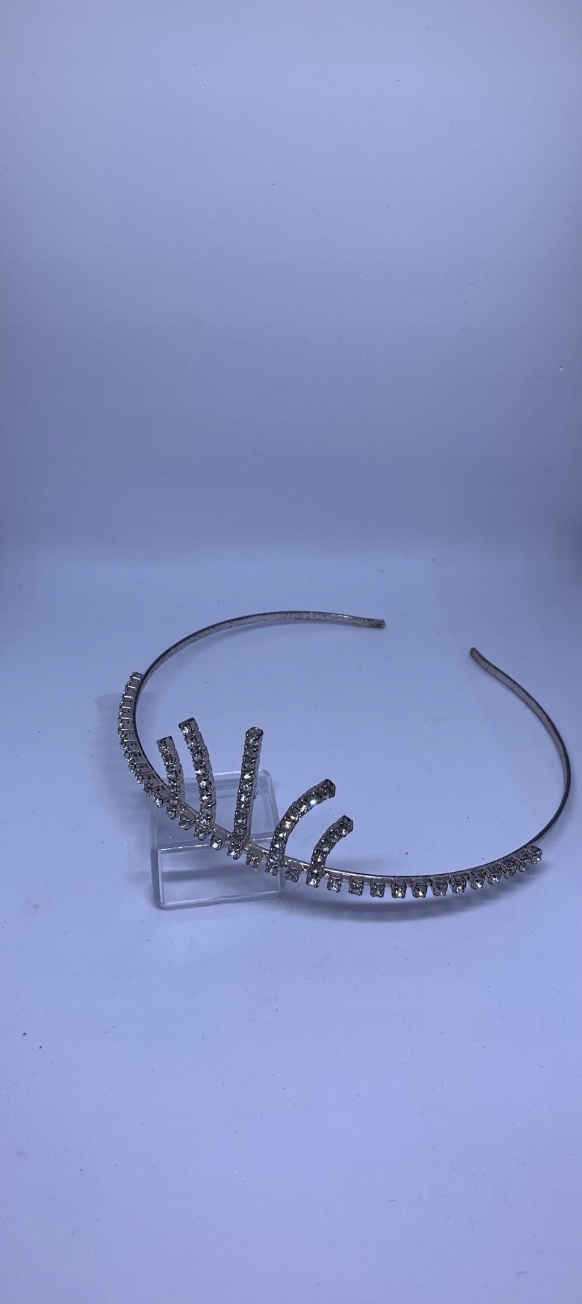 Особенности/Детали: Диадема имеет форму классической полосы, которая в центральной части поднимается вверх, образуя несколько (например, пять) характерных слегка изогнутых «лучей» или «зубцов короны» разной высоты. Как основная часть ленты, так и восходящие элементы густо усеяны мелкими круглыми кристаллами, расположенными ровными рядами. Все это прочно и выглядит очень роскошно и элегантно.