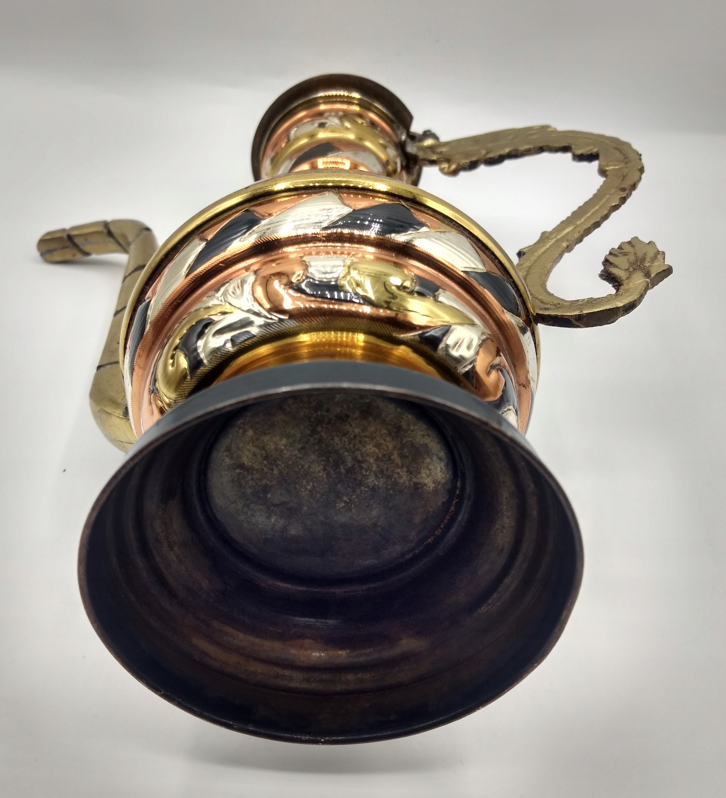 - изделие повсюду имеет декоративное тиснение, есть посередине - верблюды, ручка - слепок дракона/змеи,