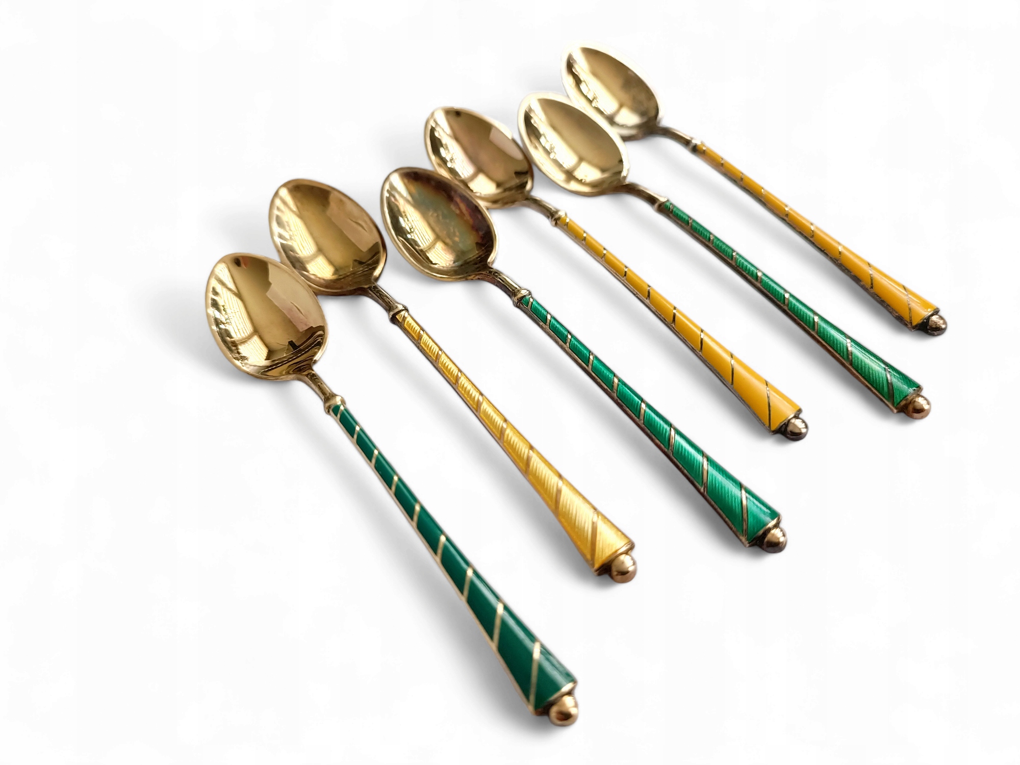 чайная ложка, украшенная эмалью на гильосе в зеленом и желтом, эмале без видимой раздавлива. влияние.
