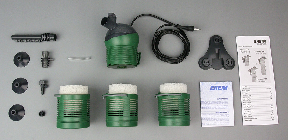 eheim Aquaball 180 -это модульный внутренний фильтр с шаровой головкой. Шар с выходом водяного потока установлен в гнезде, что позволяет полной свободе устанавливать направление оттока воды. Сила потока может быть регулируется благодаря ручке на розетке. Фильтр дополнительно аэрировал аквариум благодаря прикрепленному диффузору. Фильтр очень прост в использовании и техническом обслуживании, промывочные детали для стирки занимают несколько секунд. Модули содержат специальную пену, которая отвечает за механическую фильтрацию. Модульная система очень хорошо продумана, в любое время вы можете поместить уголь, торф или другую вставку в отдельный модуль, реагируя на потребности аквариума, без необходимости помещать их на внешний фильтр. Это экономит время и упрощает установку специализированных картриджей. Фильтр может быть расширен с помощью последующих модулей путем увеличения его фильтра