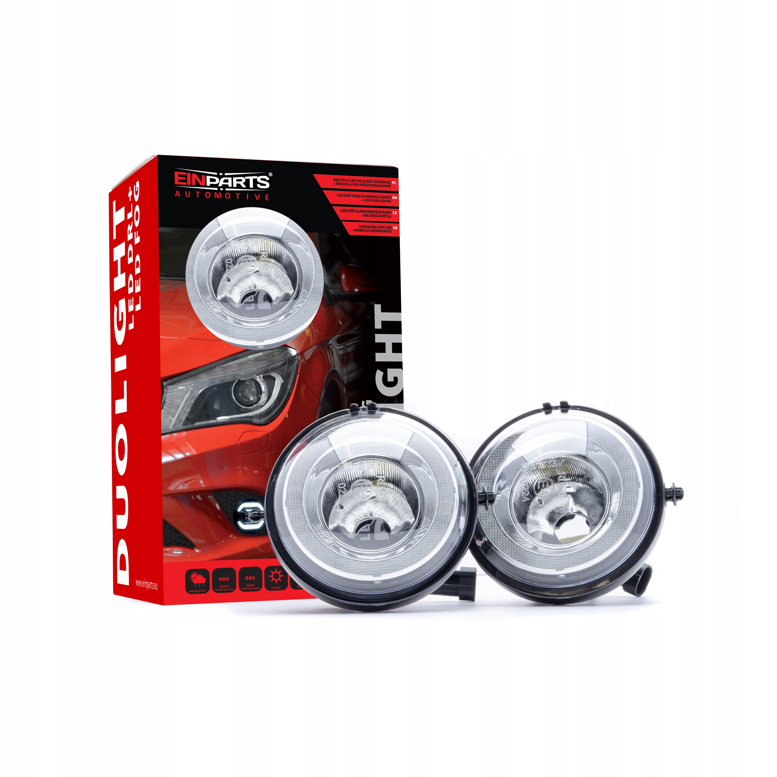Модель EinParts DUOLIGHT DL35 оснащена держателями, адаптированными под оригинальные крепления противотуманных фар. Это замена противотуманной фары, т.е. просто снимаем оригинальные галогенные лампы и заменяем их лампами DUOLIGHT - никаких доработок, все идеально подходит. Duolight – это уникальный светильник с двумя функциями – дневной и противотуманный свет в одной! Для создания дневного света была использована новейшая технология световых линий, благодаря которой свет получается равномерным и не видно никаких точек света. Для подсветки оптоволокна были установлены лучшие диоды, доступные на рынке - американского производителя CREE.