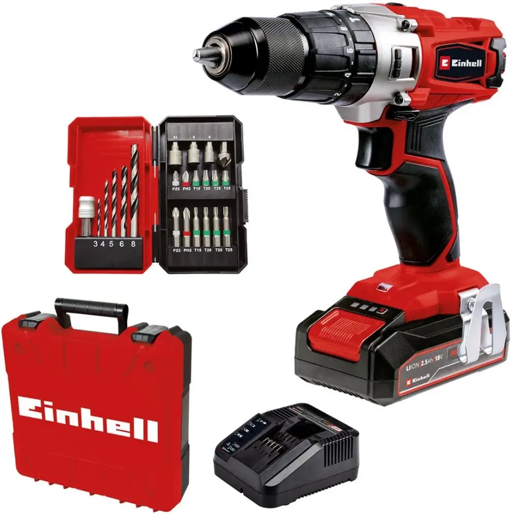 - Power x-Chame-Battling Drill-Choulener с инсультом TE-CD 18/2 Li-I +22 (1x2,5AH) инсульт является одним из семейства Einhell Power X-Change. Вы можете гибко объединить батареи, зарядные устройства и устройства. TE-CD 18/2 Li-I +22 (1x2,5 AH) поставляется с батареей 2,5 AH, зарядным устройством, туловищем и набором оборудования из 22 частей.