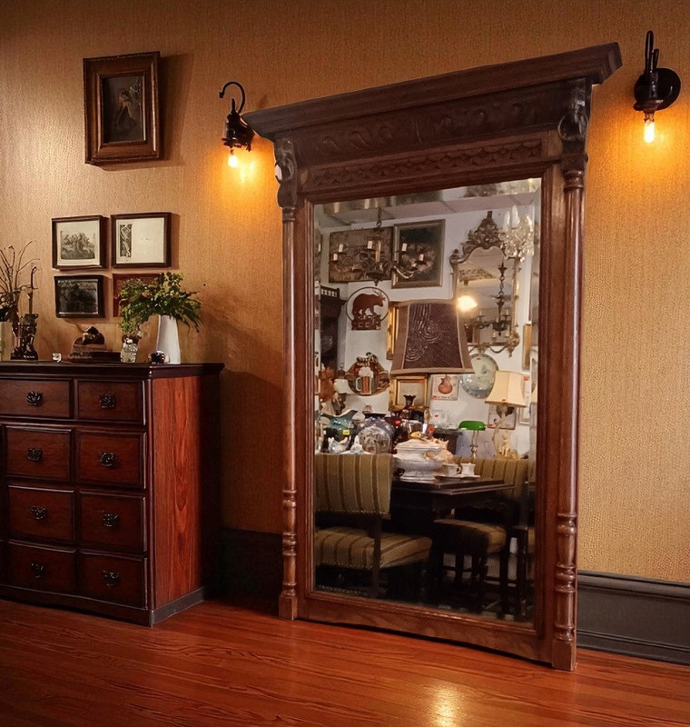 Стильное зеркало в стиле эклектика. Рама зеркала изготовлена из дерева с изящным декором, скошенное стекло ручной работы. Зеркало очень привлекательное и декоративное. Несмотря на то, что ему около 80 лет, состояние очень хорошее. Он непременно станет практичным украшением вашего дома.