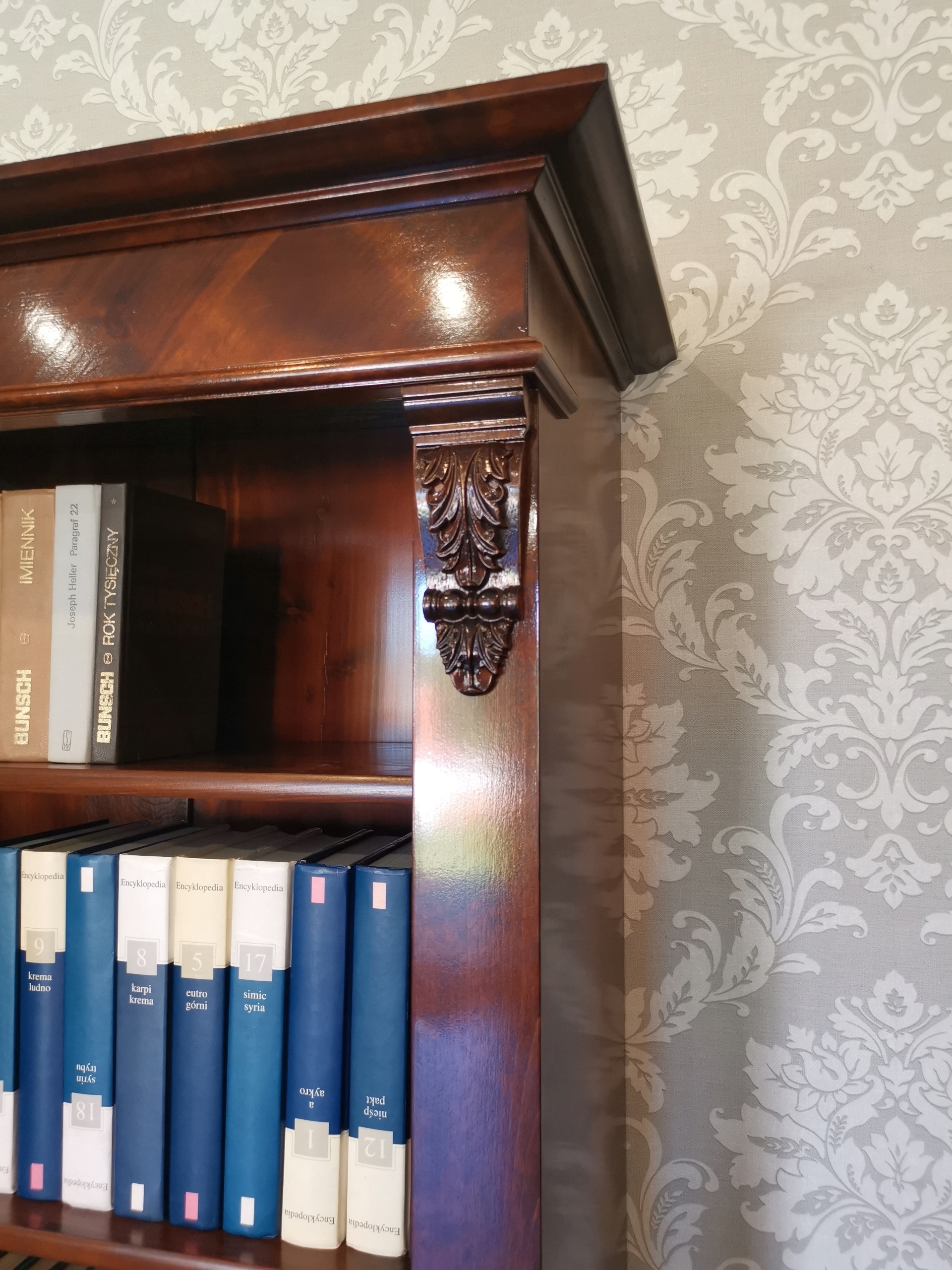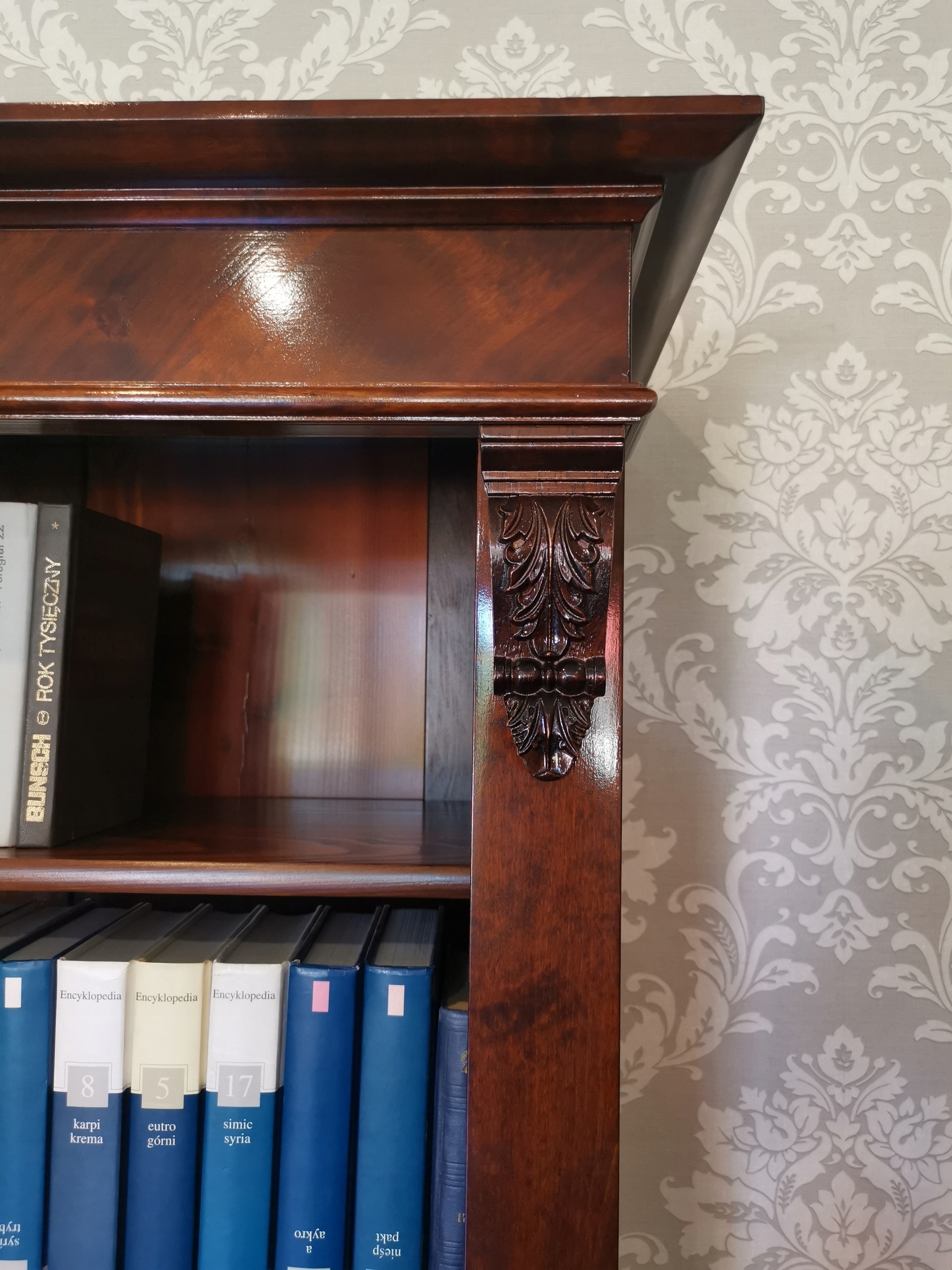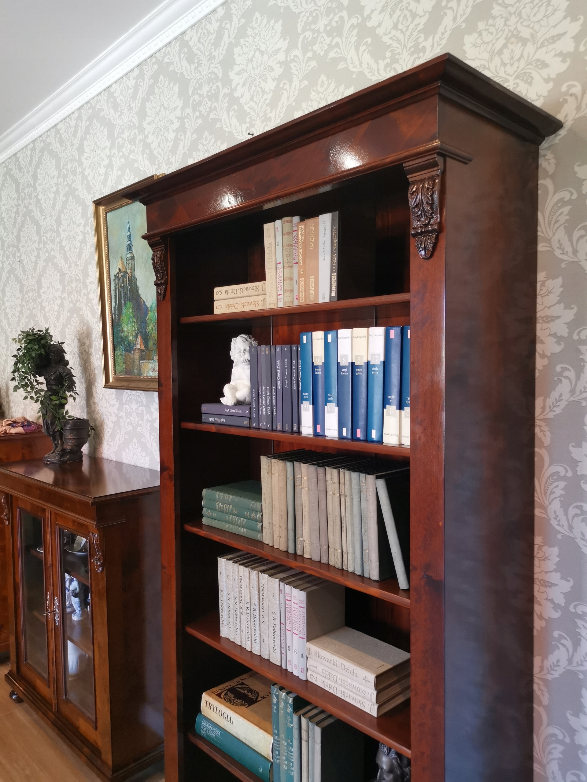Предлагаем Вам эклектичный книжный шкаф. Мебель облицована ореховым шпоном, окрашена в ореховый цвет и отполирована глянцем.