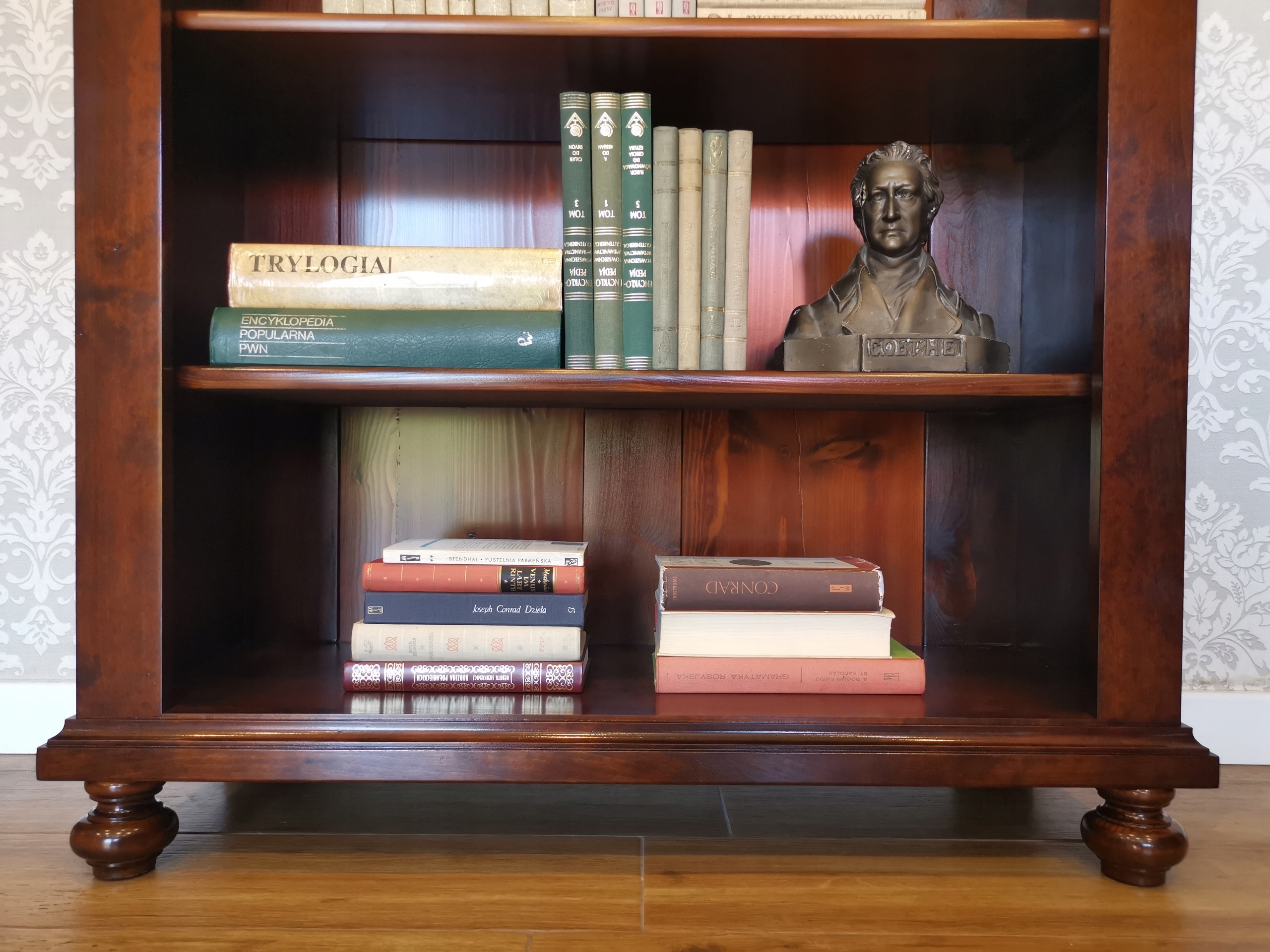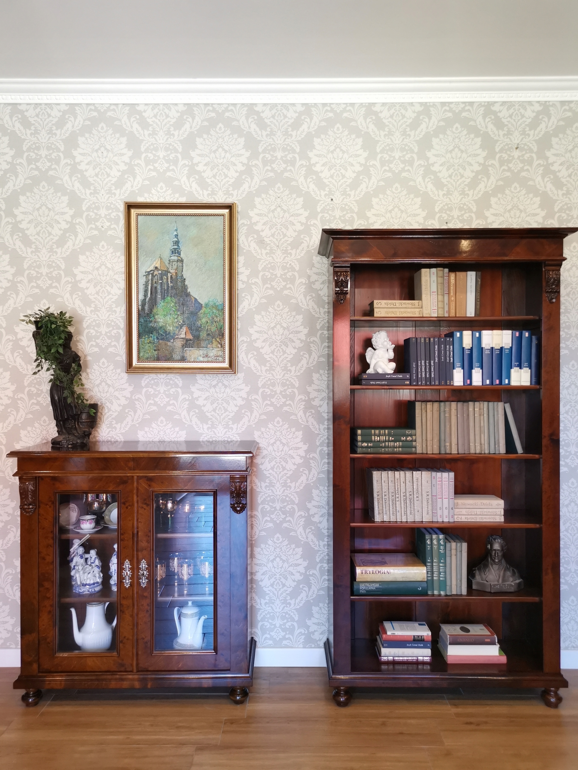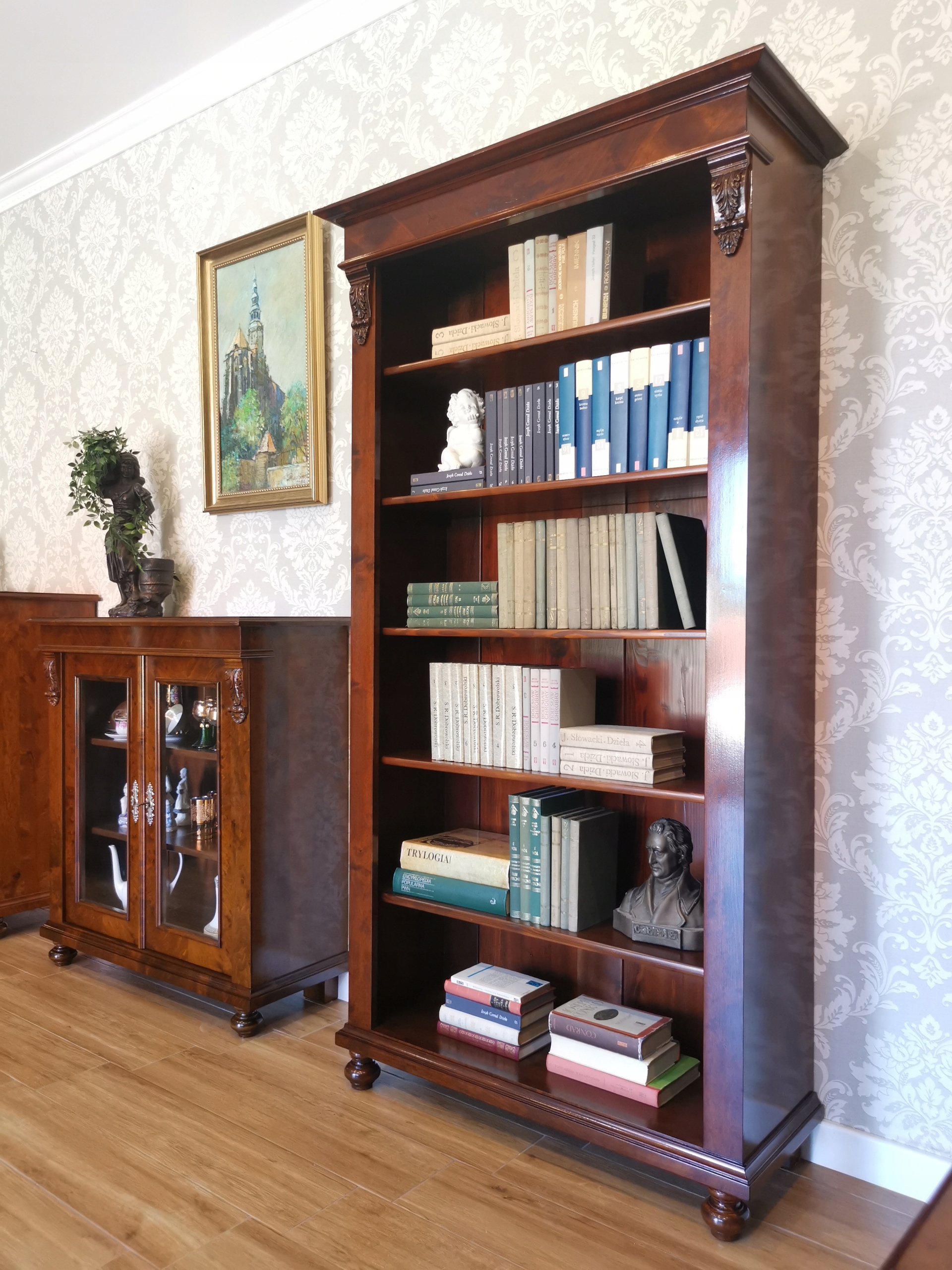 Предлагаем Вам эклектичный книжный шкаф. Мебель облицована ореховым шпоном, окрашена в ореховый цвет и отполирована глянцем.
