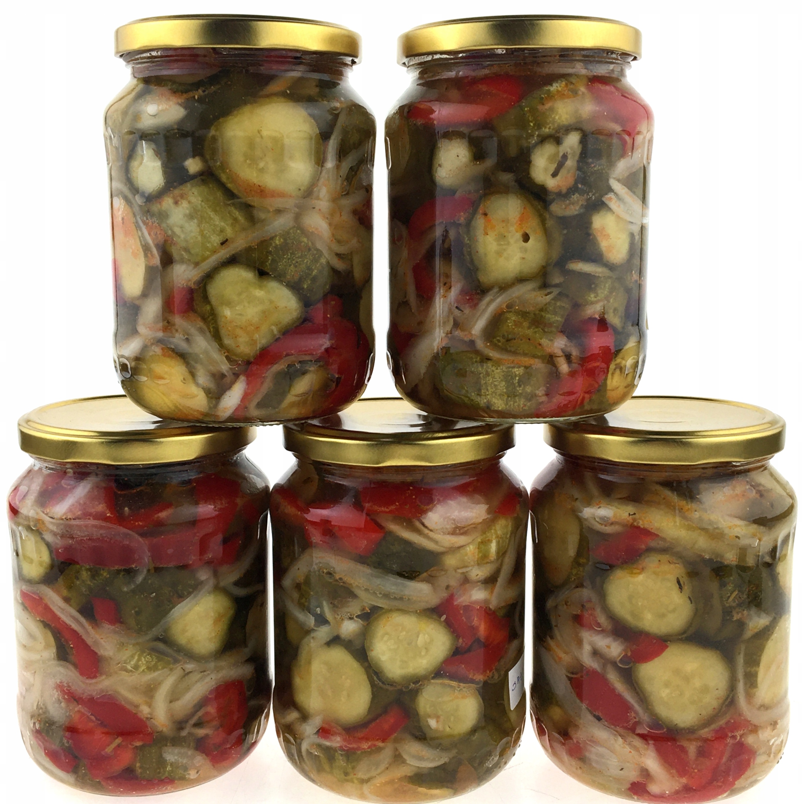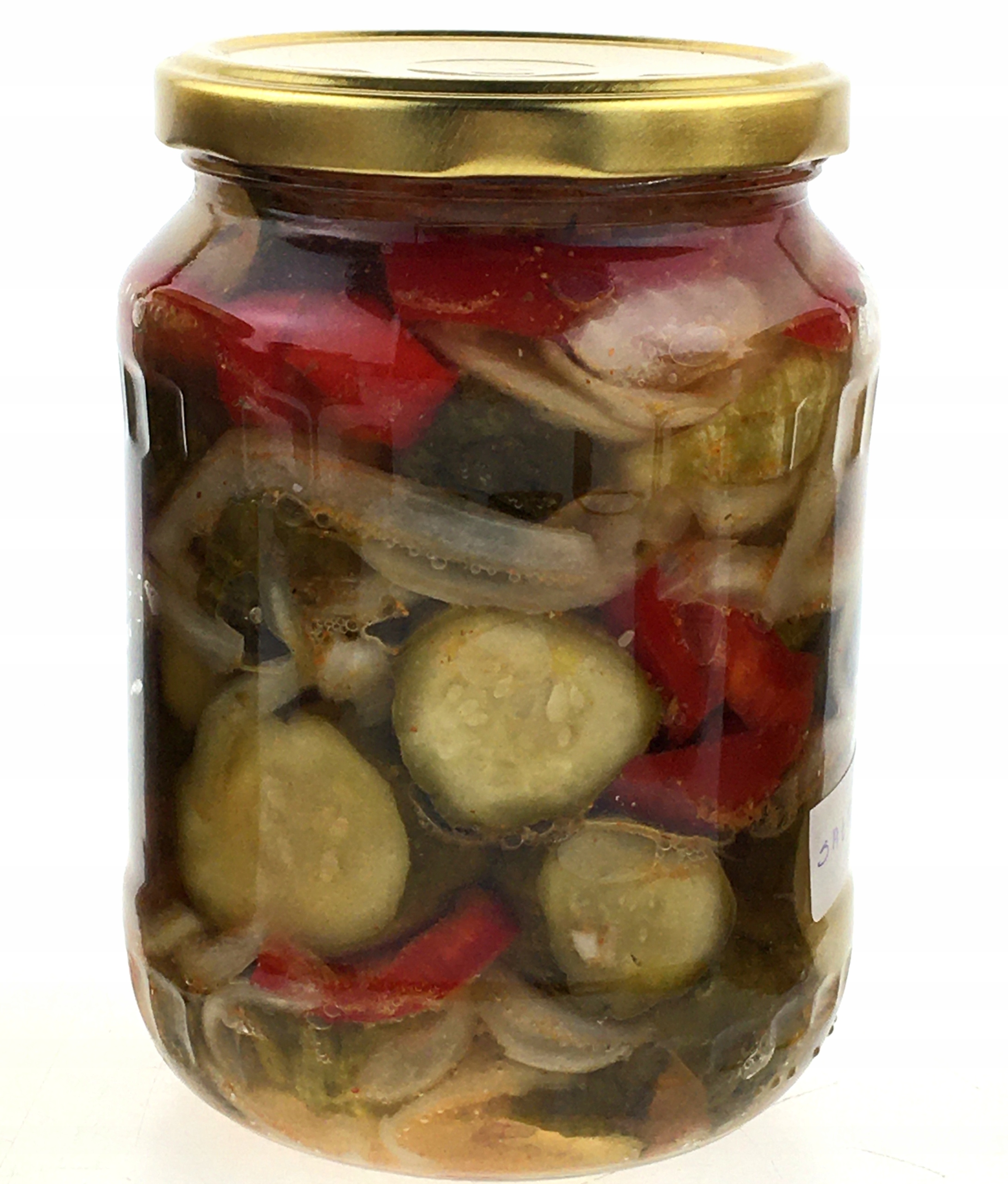 В банке есть огурцы, разрезанные на более толстые ломтики/кусочки, перец, лук, чеснок, соль, сахар, масло, уксус и шашлыки для специй. Весь пастеризованный 20 минут.