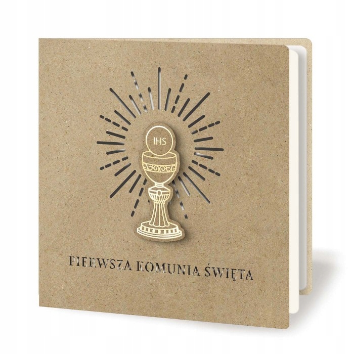 Приглашение на первое причастие, с готовым текстом, который нужно написать. Текст внутри вкладыша универсален для девочек и мальчиков. Обложка изготовлена из 100% экологической, плотной коричневой бумаги KRAFT плотностью 350 г. На обложке вырезанный лазером религиозный мотив и надпись «Первое Святое Причастие». Лазерная резка выполняется с высочайшей точностью. Вкладыш выполнен из матовой бумаги цвета экрю, весом 120 г. Обложка и вкладыш имеют закругленные углы.