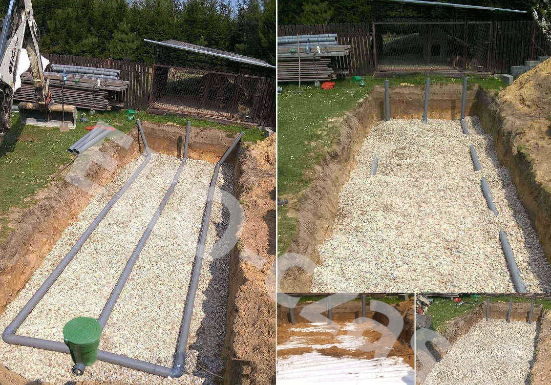 Дренаж выполнен из нарезанных труб ПВХ, без прокладок, диаметром 110 мм. Это типичные трубы, используемые в строительной отрасли, и после соответствующей резки они приспособлены для нужд инфильтрации сточных вод.