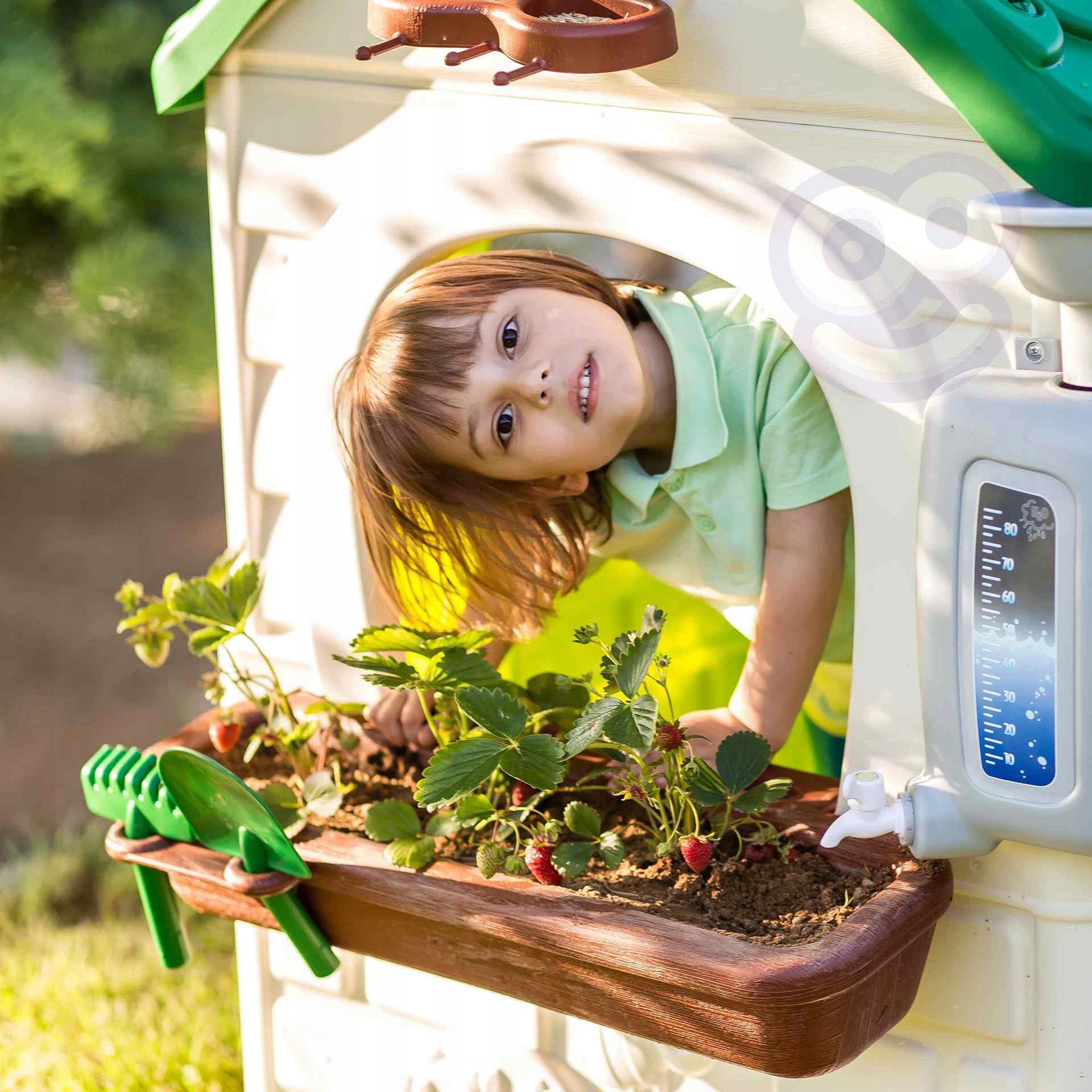 FEBER ECO House — это игровой домик, в котором есть все занятия, необходимые детям, пробуждающие любопытство к природе . Отличное место и отличное обучение для детей!. В набор входят 2 контейнера для мусора (желтый и синий), небольшой сад (в горшках) и инструменты. Это отличное развлечение для детей на свежем воздухе. Вы можете весело провести время, сажая семена и наблюдая, как растут растения. Он также оборудован кормушкой для птиц, а дождевая вода идеально подходит для полива растений или цветов. Ветряная мельница и имитация солнечной панели предоставляют потрясающие возможности для изучения устойчивых источников энергии! Прочный, простой в установке и оснащен системой защиты от ультрафиолета, предотвращающей потерю цвета и повышающей стойкость материала.