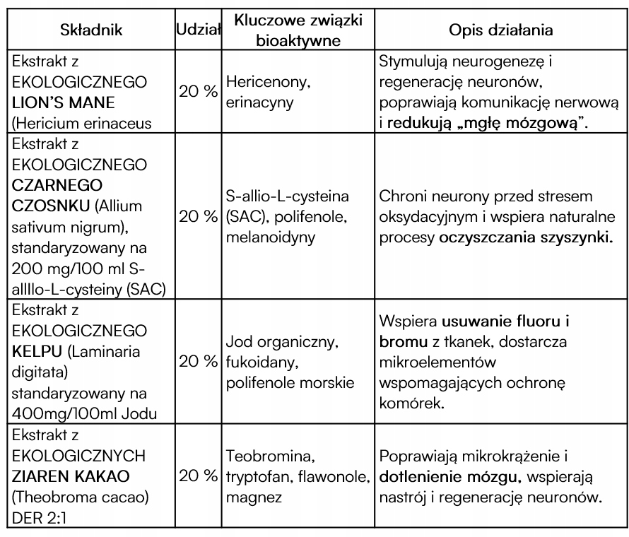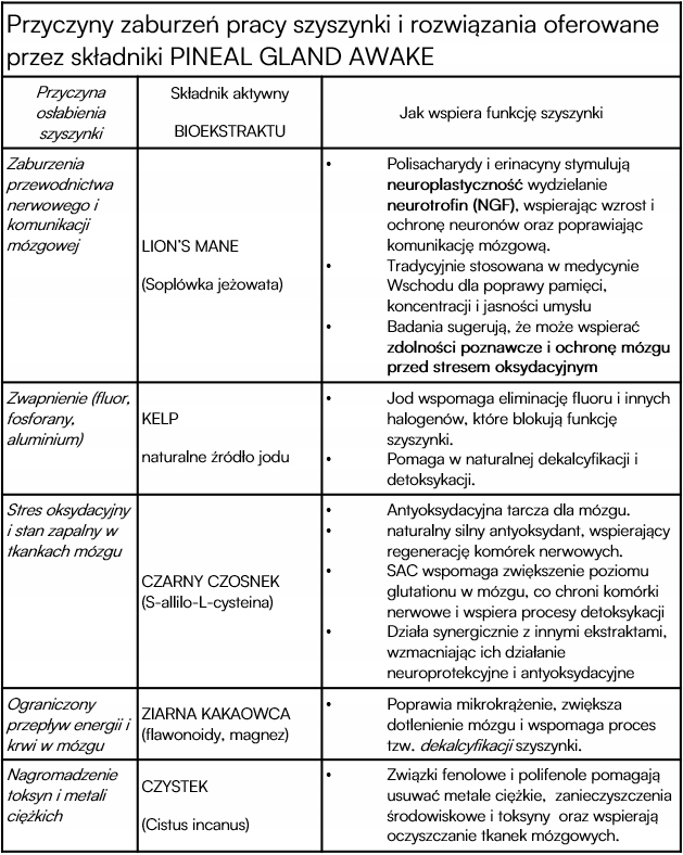 Композиция растительных экстрактов, действующая синергично, поддерживающая естественные процессы очищения, декальцинации и регенерации шишковидной железы - железы, ответственной, среди прочего, за биологические ритмы, восприятие и нейрохимический баланс.