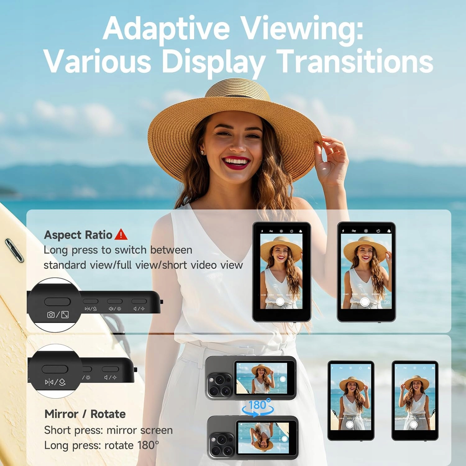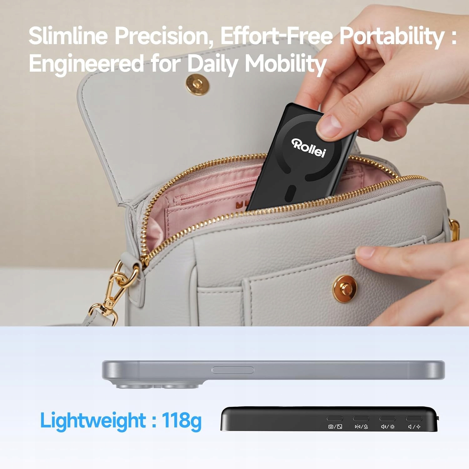 Установка очень проста. Rollei Easy Creator Selfie Monitor просто размещается на задней панели устройства, где обычно расположена лучшая камера. Для крепления используется магнитная технология MagSafe, а дальность беспроводного соединения составляет до 50 метров. Селфи-монитор Rollei Easy Creator легкий и удобный в переноске, поэтому вы сможете полностью раскрыть свой творческий потенциал. Rollei Easy Creator Selfie Monitor — инновационное решение для создателей контента, которые хотят использовать качественную заднюю камеру своего смартфона, сохраняя при этом контроль над снимком. Благодаря **3,97-дюймовому IPS-дисплею с разрешением 480 × 800 пикселей вы можете наслаждаться идеальным предварительным просмотром записанного изображения, используя основную камеру телефона. Монитор характеризуется чрезвычайно низкой задержкой всего 40 мс, что обеспечивает плавное изображение практически в реальном времени, аналогичное проводному соединению. Благодаря беспроводному соединению с радиусом действия до 50 метров и магнитному держателю, совместимому с MagSafe, вы получаете максимальную гибкость в создании контента. Встроенный триггер Bluetooth с радиусом действия 10 метров обеспечивает удобное дистанционное управление.